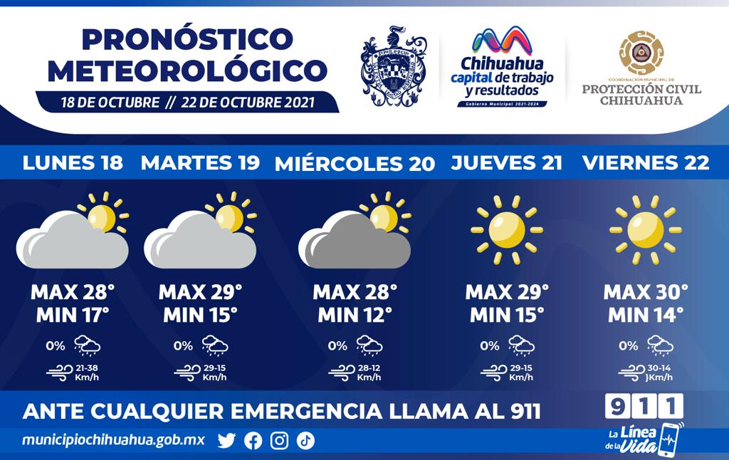 Leer másChihuahua.- La Coordinación Municipal de Protección Civil informa que para esta semana se esperan días nublados, sin probabilidad de lluvias, de acuerdo al pronóstico que emite el Servicio Meteorológico Nacional; asimismo, se tendrán temperaturas agradables con máximas de 30°C, sin embargo, se exhorta a tomar precauciones ante el descenso de las mismas durante las noches y madrugadas. Para este lunes, martes y miércoles habrá cielo mayormente nublado, con temperaturas máximas que ...