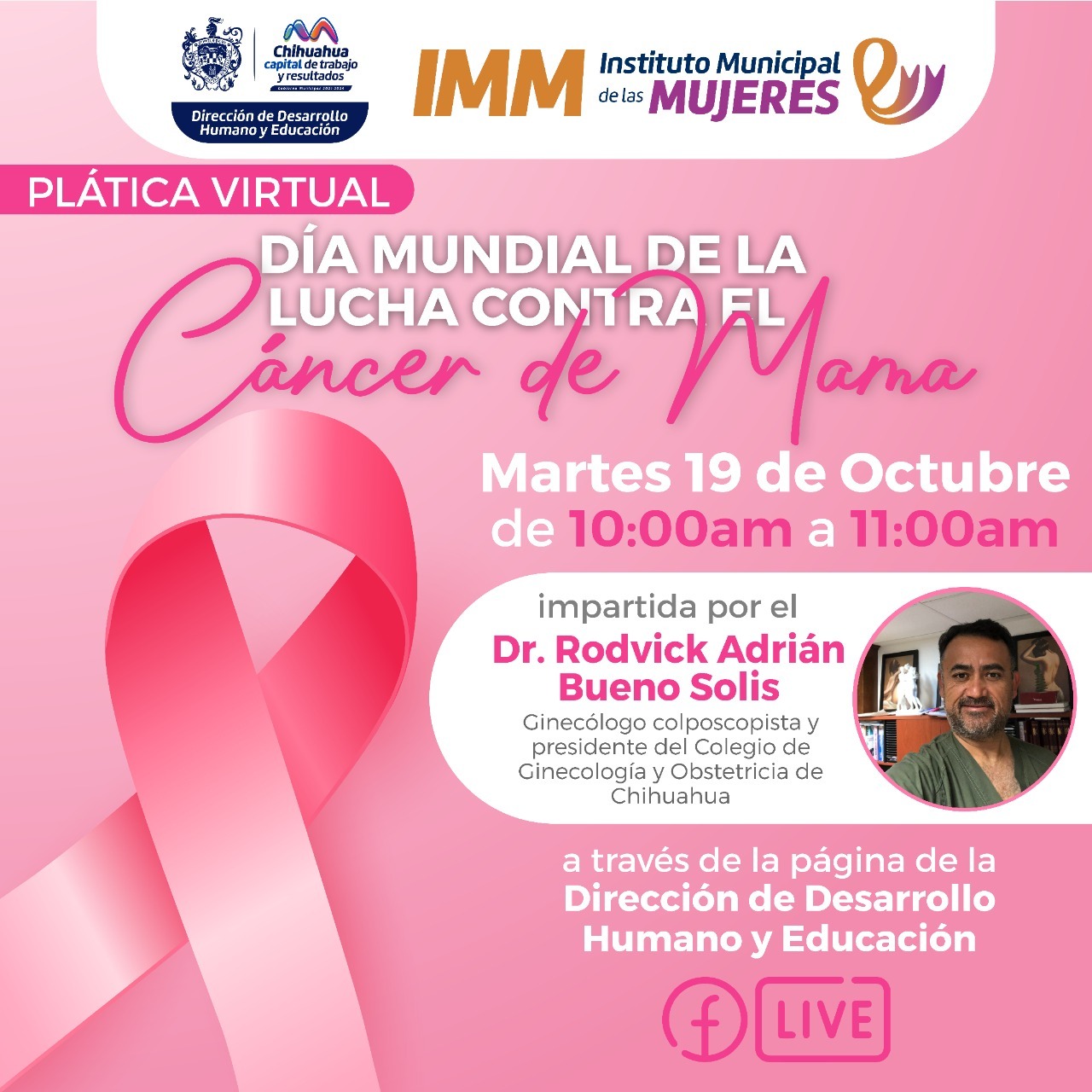 Leer másChihuahua.- El Gobierno Municipal, a través de la Dirección de Desarrollo Humano y Educación estarán impartiendo la charla “Día Mundial de la Lucha Contra el Cáncer de Mama” en el marco de las actividades del mes de la sensibilización sobre el cáncer de mama. El Dr. Rodvick Bueno Solís, ginecólogo y presidente del Colegio de Ginecología y Obstetricia de Chihuahua, especialista en el tema, impartirá la plática el próximo 19 de ...