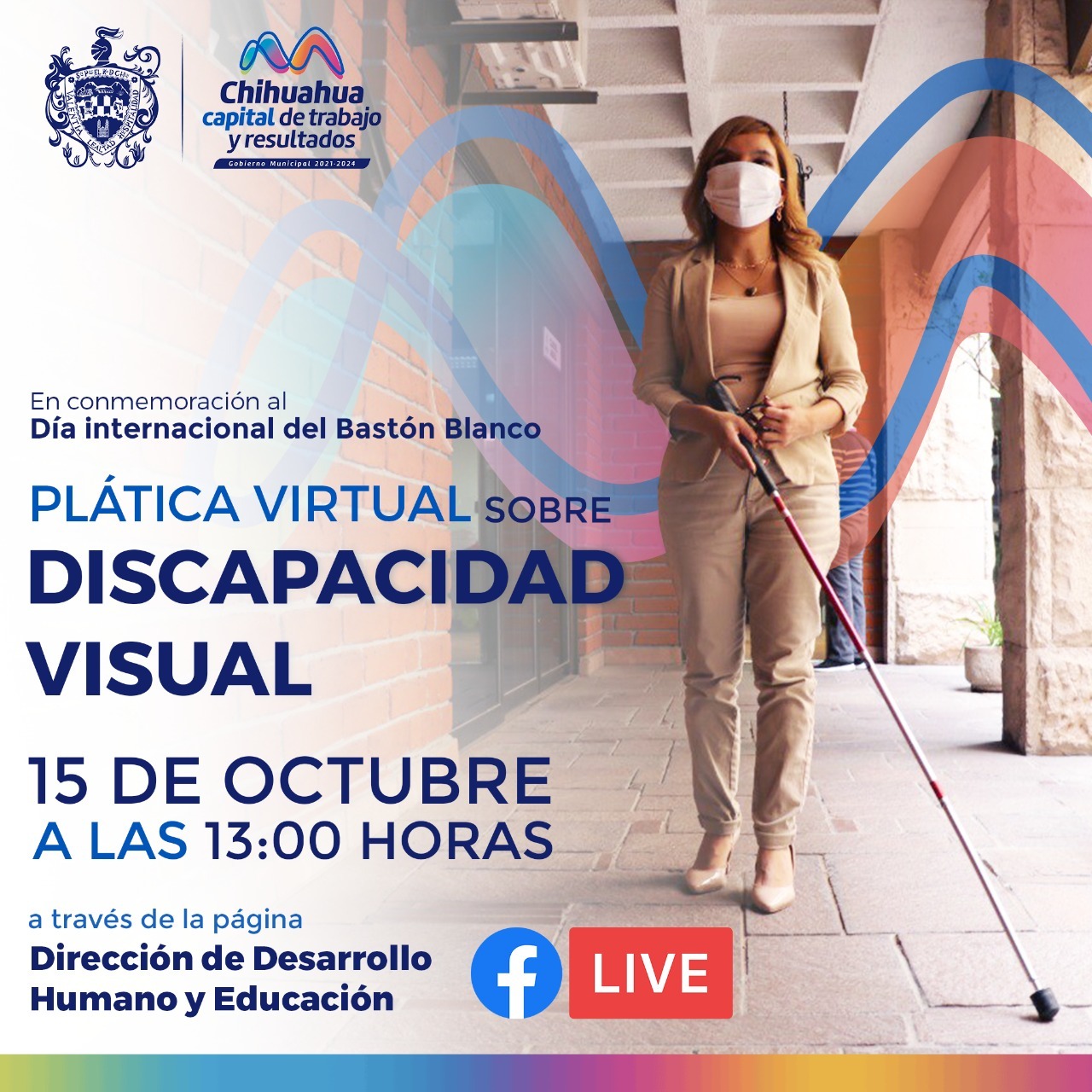 Chihuahua.- Con motivo del Día Internacional del Bastón Blanco, que se celebrará el próximo 15 de octubre, el Gobierno Municipal, a través de la Dirección de Desarrollo Humano y Educación, impartirá una plática sobre la discapacidad visual y sus tipos. “Discapacidad Visual: ceguera y baja visión” es abierta a todo el público y se transmitirá vía Facebook Live en la página oficial de la Dirección de Desarrollo Humano y Educación: https://bit.ly/3jm4TTN, ...