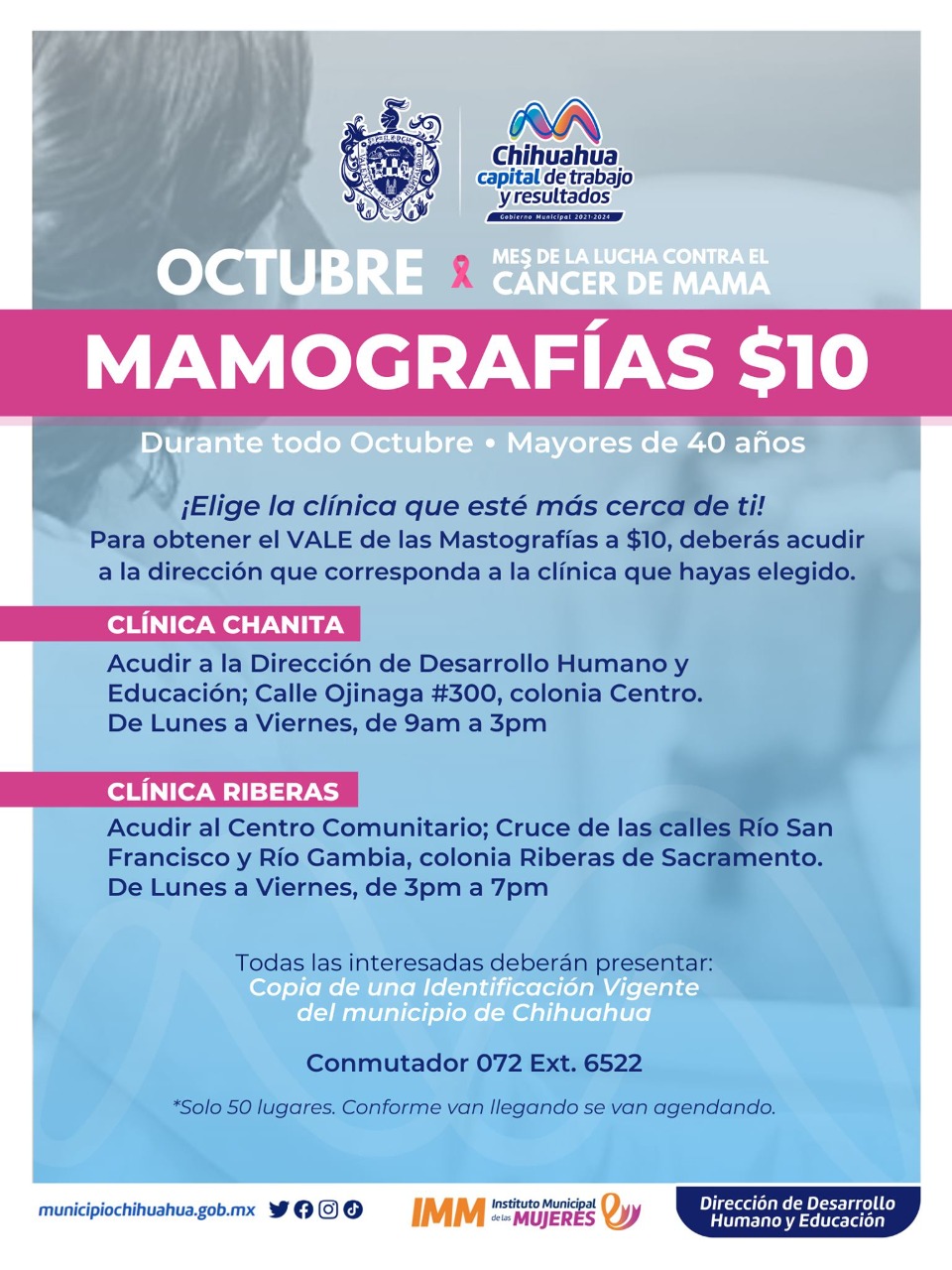 Leer másChihuahua.- El Gobierno Municipal, a través de la Dirección de Desarrollo Humano y Educación y el Instituto Municipal de las Mujeres, en conjunto con la Fundación Adelaida Lafón, ofrecen mamografías a bajo costo a las mujeres mayores de 40 años durante octubre que es el mes de la Sensibilización sobre el Cáncer de Mama Con el fin de concientizar sobre la prevención del cáncer de mama, que es la primera causa ...