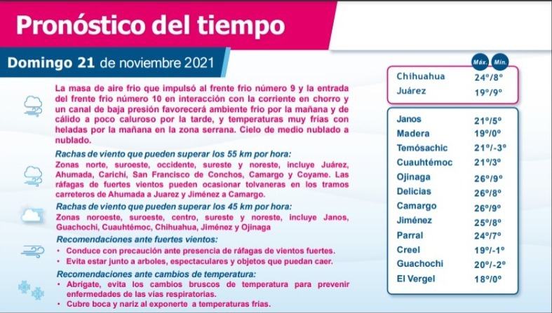 Juárez.- De acuerdo con el Servicio Meteorológico Nacional, la Dirección General de Protección Civil, pronostica una alerta amarilla para este día por la probabilidad de ráfagas de hasta 45 kilómetros por hora y por la noche cambia a alerta verde por ráfagas de 39 kilómetros por hora. Durante el día se espera que el termómetro alcance los 19°C, con vientos de 10 a 19 kilómetros por hora y para la noche ...