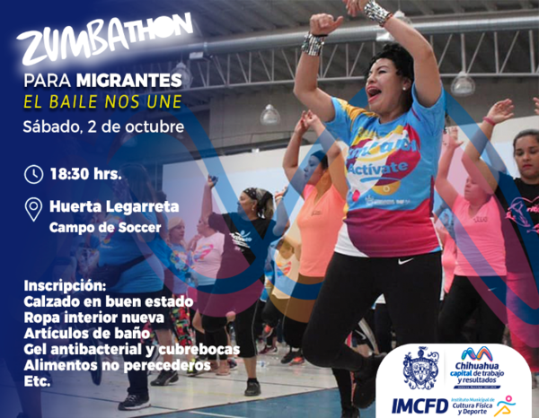 Leer másChihuahua.- El Gobierno Municipal de Chihuahua a través del Instituto Municipal de Cultura Física y Deporte, invita a la ciudadanía a participar en el Zumbathon “El baile nos une”, con el objetivo de seguir recabando víveres y ropa en buen estado para las personas que se encuentran de paso en la ciudad. El evento se llevará a cabo el próximo sábado 2 de octubre a partir de las 18:30 horas en ...