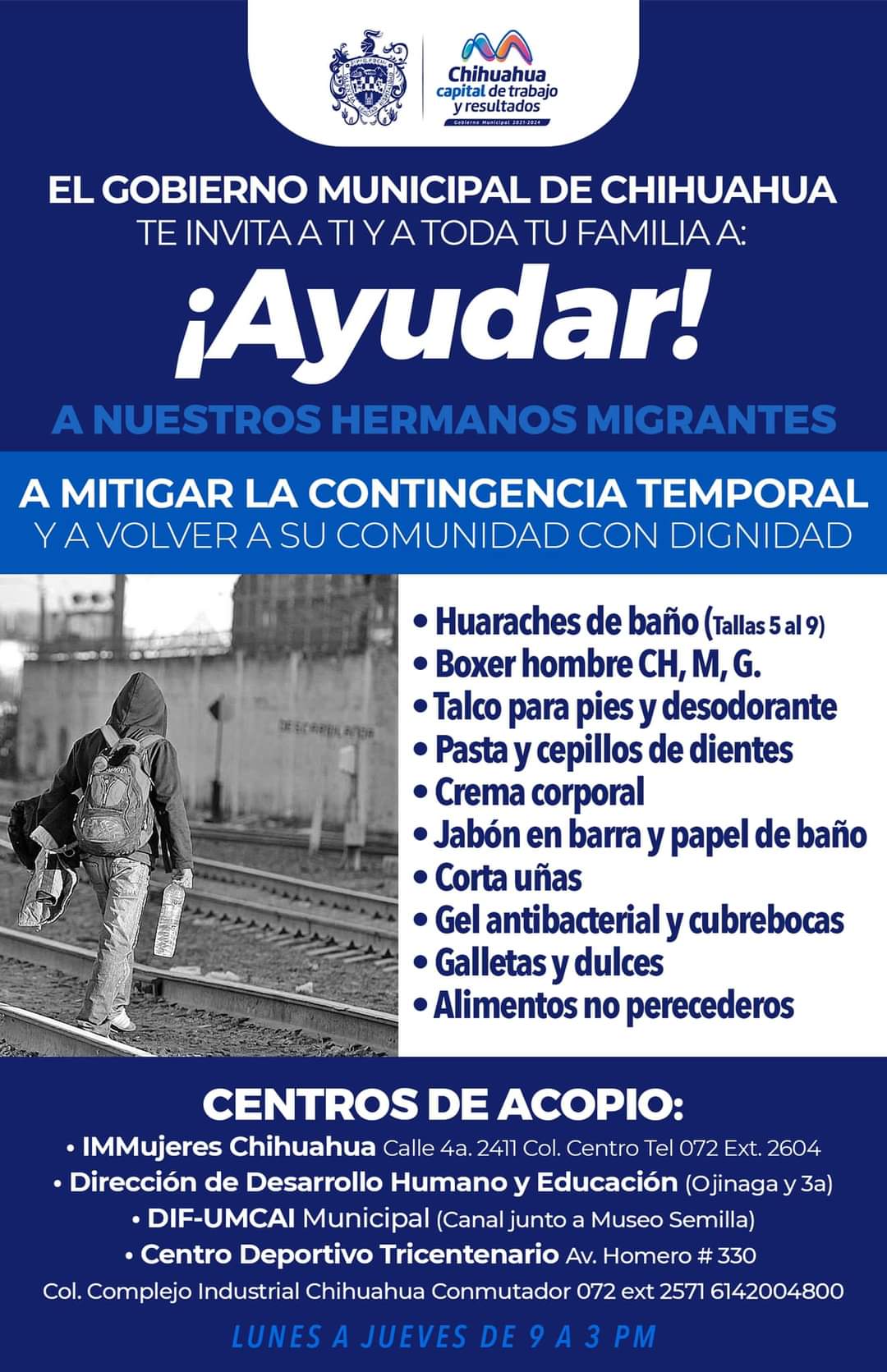 Leer másChihuahua.- Ante la ola de migrantes que se avecinó a la ciudad de Chihuahua, el gobierno municipal, pide apoyo y solidaridad a la ciudadanía a través de sus redes social. Ye s que este domingo a través de un mensaje de Facebook, en el que pidieron sandalias de hombre, ropa interior de hombre, desodorante, talco, cepillos de dientes y pasta dental, crema corporal, corta uñas, gel anti bacterial y cubrebocas, galletas ...