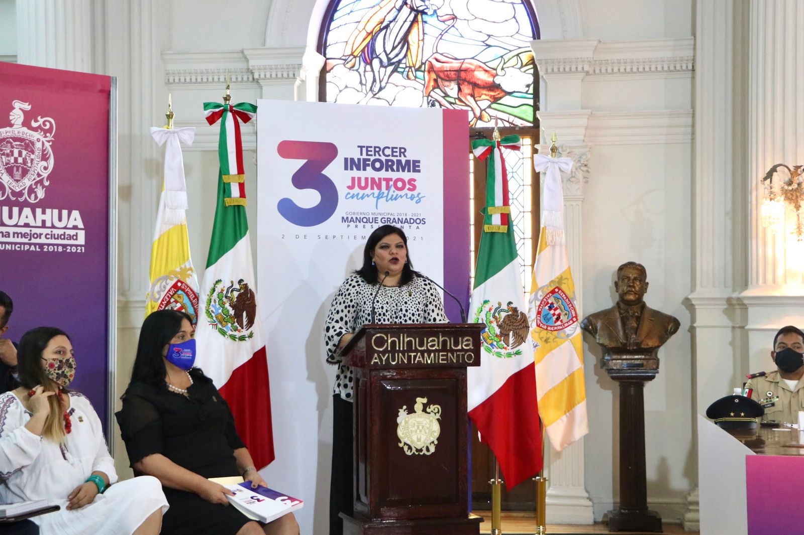 Leer másChihuahua. – Con un pequeño aforo, de apenas el 30% de la capacidad del recinto y con todas las medidas de sanidad, la alcaldesa de Chihuahua María Angélica Granados Trespalacios, entregó su informe de gobierno al Cabildo de la capital del estado, esto en el salón de Cabildo del Ayuntamiento. Entre los invitados especiales destacaron en esta ocasión el Magistrado de la cuarta sala del Tribunal de Justicia del Estado, José ...