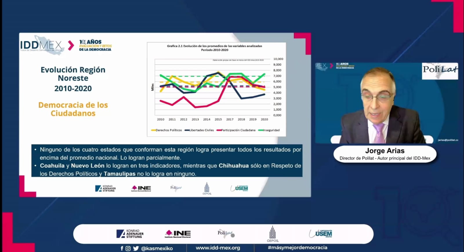 Leer másChihuahua. - La fundación Konrad Adenauer, el Instituto Nacional Electoral, PoliLat, el Centro de Estudios Políticos y Sociales y la Unión Social de Empresarios de México, presentaron el Índice de Desarrollo Democrático de México, IDD-Mex, 10 años de evolución y retos de la democracia. El Índice de Desarrollo Democrático evalúa y mide con datos verificables, en los 32 estados de la República, a través de cuatro dimensiones: democracia de los ciudadanos, ...