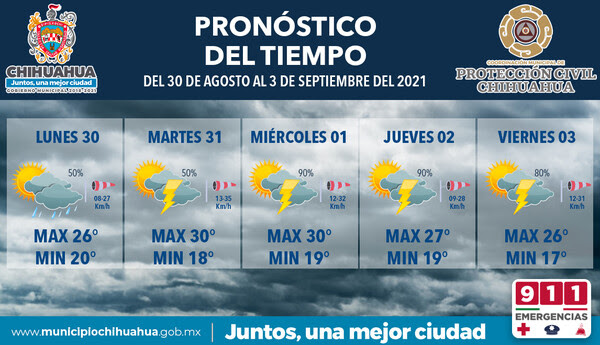 Chihuahua.-Debido a los remanentes del huracán Nora, que se encuentra activo en el Pacífico Mexicano, continuarán las lluvias de fuertes a intensas y posibles tormentas eléctricas en la capital del estado, esto de acuerdo al pronóstico que emite el Servicio Meteorológico Nacional, así lo informó la Coordinación Municipal de Protección Civil, por lo cual se exhorta a la población a tomar las debidas precauciones y evitar incidentes tanto en la ...