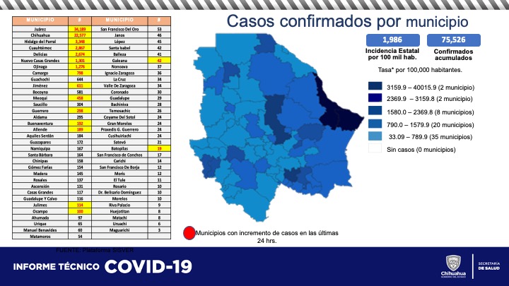 Leer másChihuahua.- 88 nuevos casos confirmados, el estado de Chihuahua llegó a 75 mil 526 contagios de COVID-19, de acuerdo con el informe diario que da a conocer la Secretaría de Salud. Además reportó el fallecimiento de una persona más ocurrido en Ciudad Juárez, para un total de 7 mil 812 personas sin vida, desde la llegada de la pandemia de SARS CoV-2 a la entidad. La información de la dependencia revela además ...