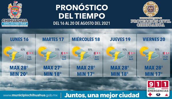 Leer másChihuahua.- La Coordinación Municipal de Protección Civil informa que para esta semana se esperan altas probabilidades de lluvias y temperaturas agradables en la ciudad, de acuerdo al pronóstico que emite CONAGUA a través de su Servicio Meteorológico Nacional, por ello es importante seguir acatando las recomendaciones para evitar incidentes. La coordinadora de la dependencia, Bianca Luz Nevárez Moreno, señaló que para los siguientes días la probabilidad de que continúen las precipitaciones ...