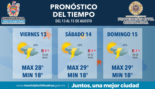 Leer másChihuahua.- La Coordinación Municipal de Protección Civil informó que de acuerdo al pronóstico que emite el Servicio Meteorológico Nacional, se esperan lluvias intermitentes para este fin de semana, por ello es importante continuar acatando las recomendaciones, a fin de prevenir incidentes. Este fin de semana se prevé un 60 por ciento de probabilidad de lluvias, este viernes se pronostica una temperatura máxima de 28 grados Celsius y mínima de 18 grados; ...