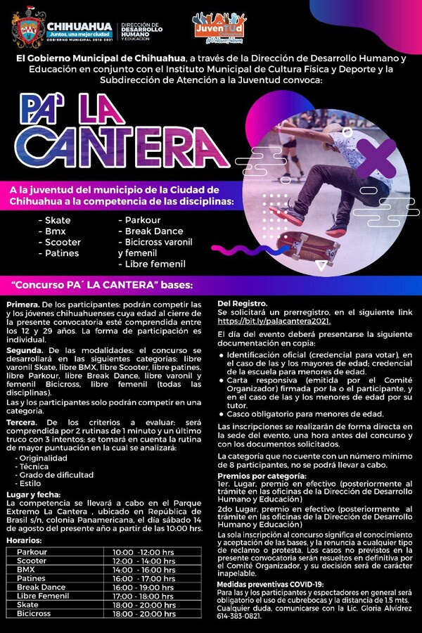 Leer másChihuahua. - El Gobierno Municipal, a través de la Dirección de Desarrollo Humano y Educación invita a todos los jóvenes del municipio que tienen entre los 12 y 29 años de edad y practican algún deporte extremo, a participar en una de las diferentes competencias que se realizarán en Pa’ La Cantera; así como disfrutar de la música en vivo que tocarán bandas locales. Este evento tiene como finalidad ofrecer un ...