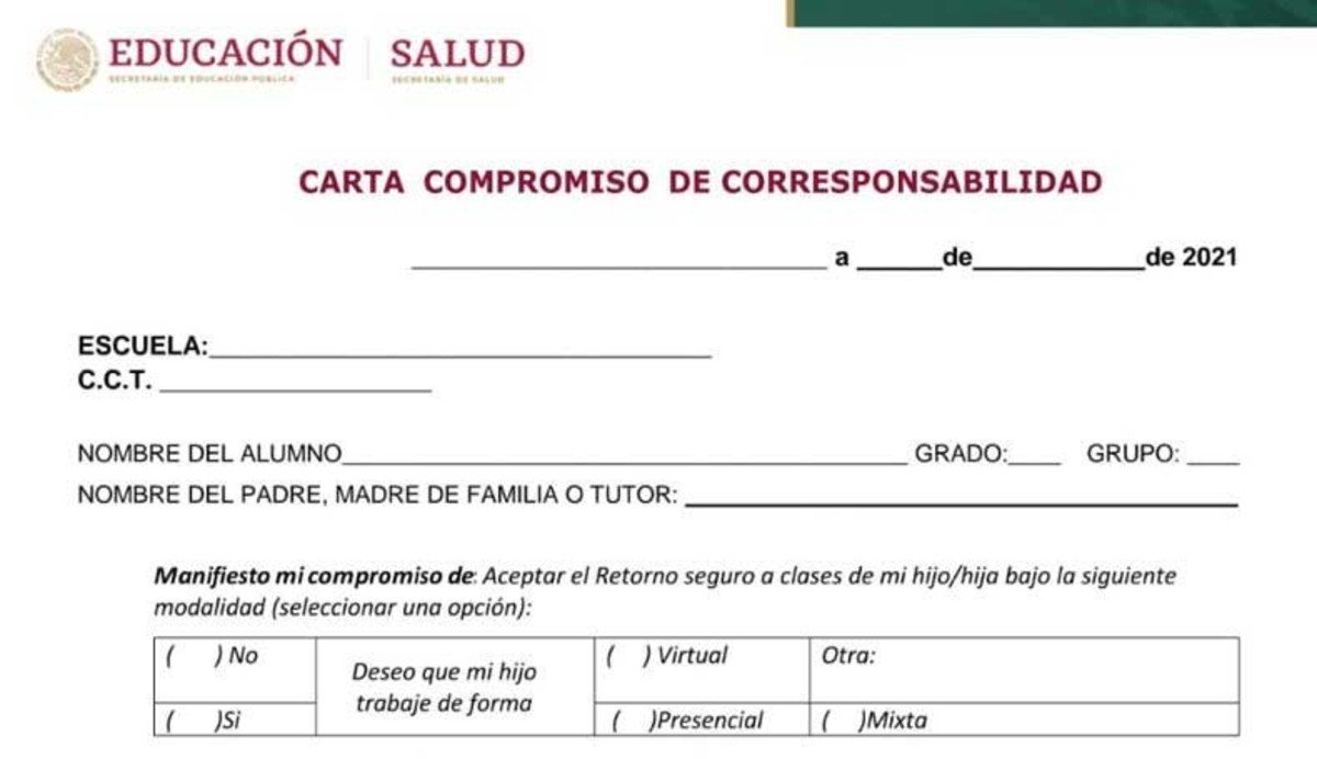 Leer másMéxico.-Delfina Gómez, titular de la Secretaría de Educación Pública (SEP), informó que para el regreso a clases en educación básica, este próximo 30 de agosto, los alumnos deberán entregar una carta compromiso de corresponsabilidad. La carta puede realizarse en el formato propuesto por la SEP o de manera libre. El formato propuesto por la SEP contiene el nombre del alumno, nombre de la escuela, grado, grupo, nombre de la madre, padre de familia ...