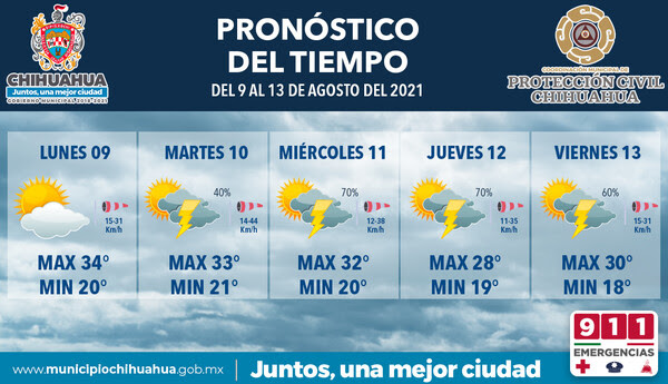 Chihuahua.- La Coordinación Municipal de Protección Civil, da a conocer que a partir de mañana martes y el resto de la semana, existen probabilidades altas de que se presenten lluvias en la capital del estado, de acuerdo al pronóstico que emite el Servicio Meteorológico Nacional. Por lo anterior es importante que los chihuahuenses tomen las medidas necesarias para prevenir incidentes en la vía pública o dentro del hogar. “Aunque serán días calurosos ...