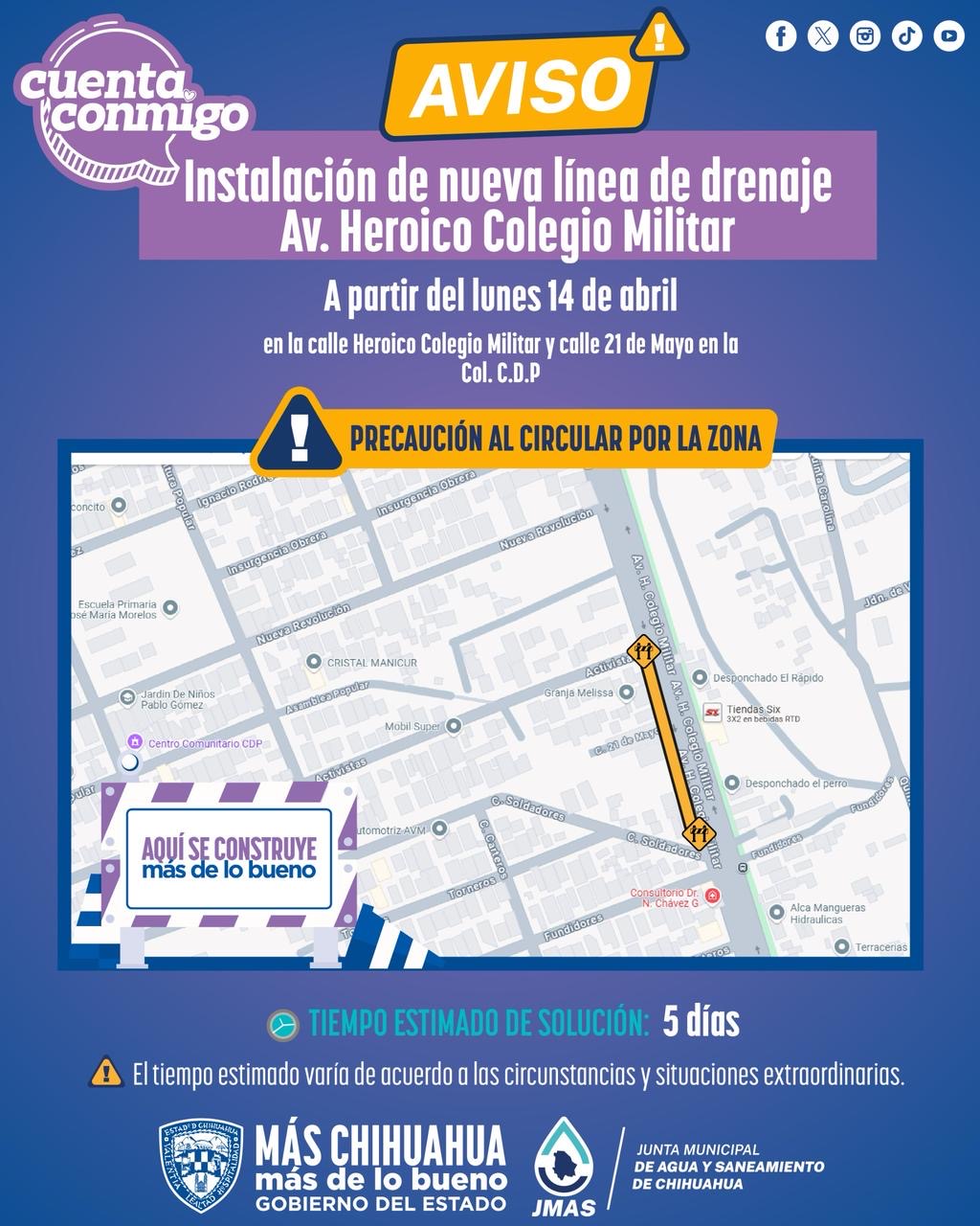 Chihuahua, Chih.- La Junta Municipal de Agua y Saneamiento (JMAS) de Chihuahua informó que este lunes 14 de abril, comenzarán los trabajos de instalación de 116 metros de tubería de drenaje en la avenida Heroico Colegio Militar y calle 21 de Mayo, en la colonia CDP. Las labores tendrán una duración de cinco días, lapso en el que permanecerá cerrado el carril de baja velocidad de la avenida Heroico Colegio Militar, ...