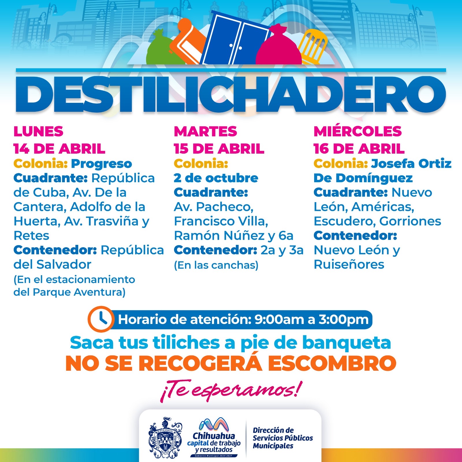 Leer másChihuahua, Chih.- El Destilichadero consiste en retirar basura de grandes dimensiones que el camión recolector no puede trasladar, por lo que se pone a disposición de la población un contenedor en un punto fijo en un horario de 9:00 de la mañana a 3:00 de la tarde de lunes a viernes, mientras que el sábado de 9:00 am a 12:00 del mediodía. Lunes 14 de abril Colonia: Progreso Cuadrante: República de Cuba, Av. ...