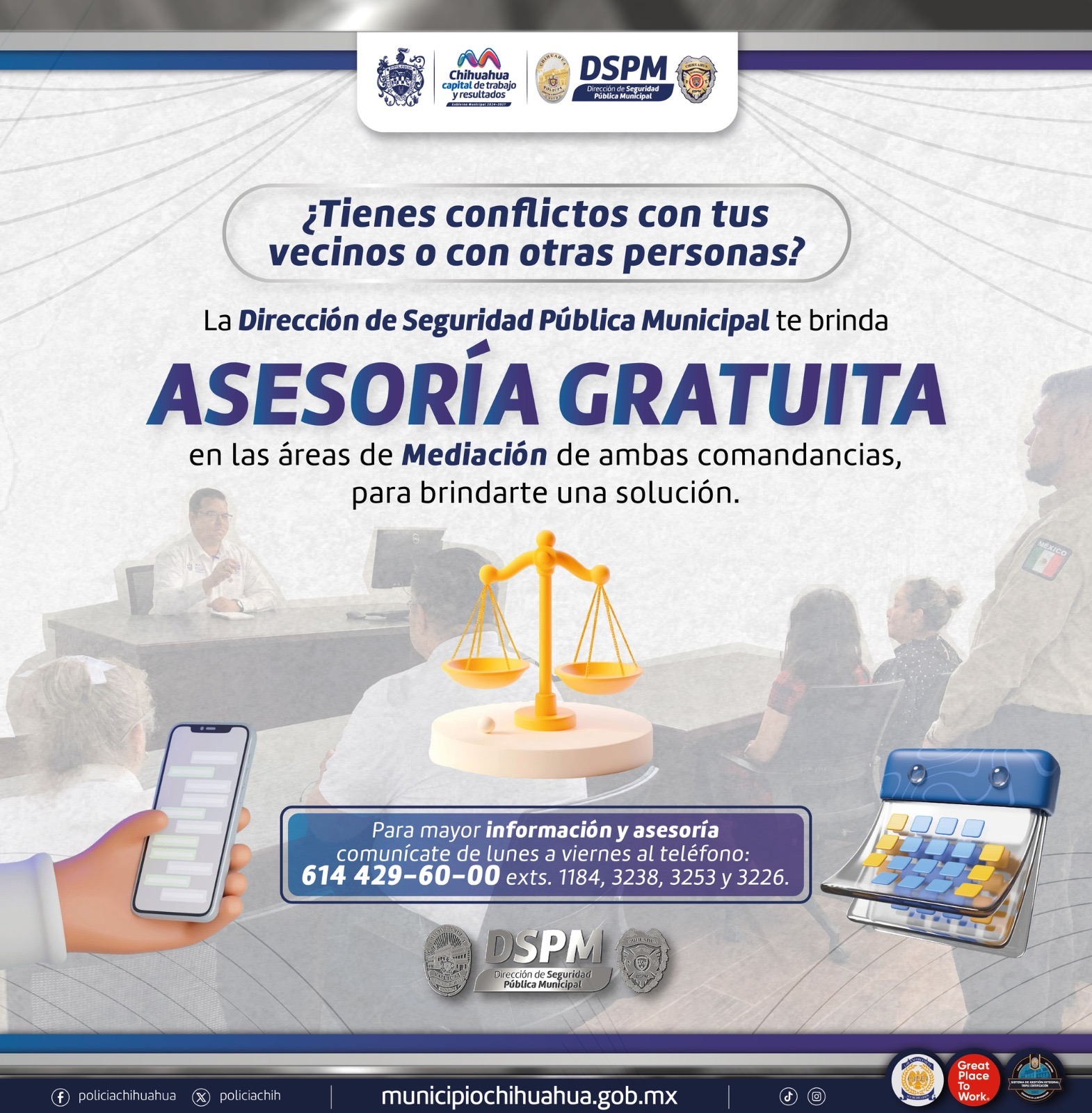 Leer másChihuahua, Chih.- Para evitar que conflictos vecinales escalen al grado de delitos y se conviertan en problemas mayores, la Dirección de Seguridad Pública Municipal (DSPM) pone a disposición de las y los ciudadanos los Centros de Mediación de Justicia Cívica, espacios destinados a la resolución de conflictos que se presentan cotidianamente en la comunidad. Diariamente se presentan situaciones conflictivas entre vecinos, que muchas veces no pueden ser resueltas por ellos mismos, ...