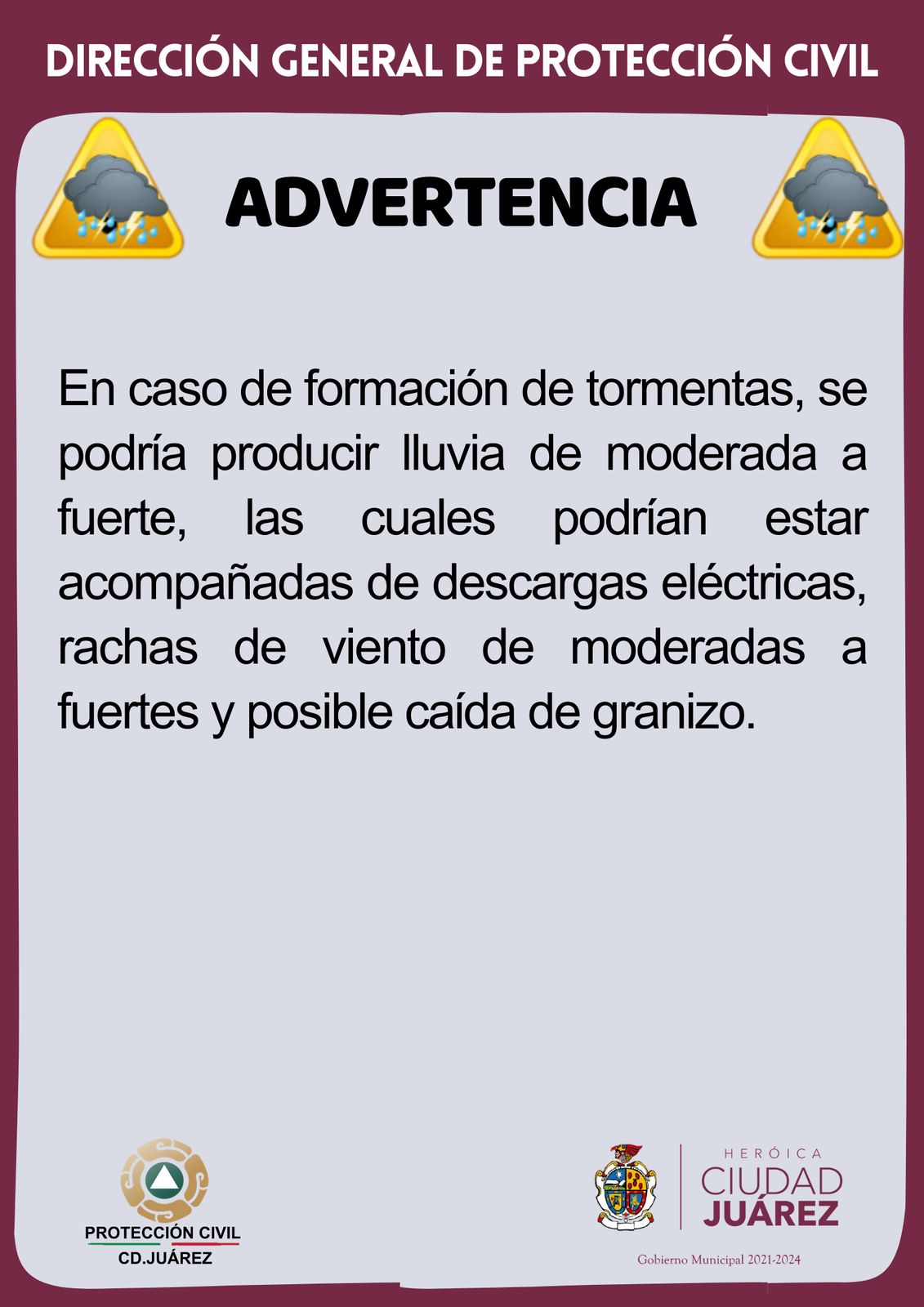 Leer másCiudad Juárez, Chih.- La Dirección General de Protección Civil informa a la población que durante el transcurso del día de hoy persistirá el potencial de lluvias, especialmente hasta horas de la tarde y noche. Se proyecta que en las próximas horas ocurran precipitaciones de ligeras a moderadas; sin embargo, en caso de que se formen tormentas, las lluvias podrían intensificarse y estar acompañadas de descargas eléctricas y caída de granizo ...