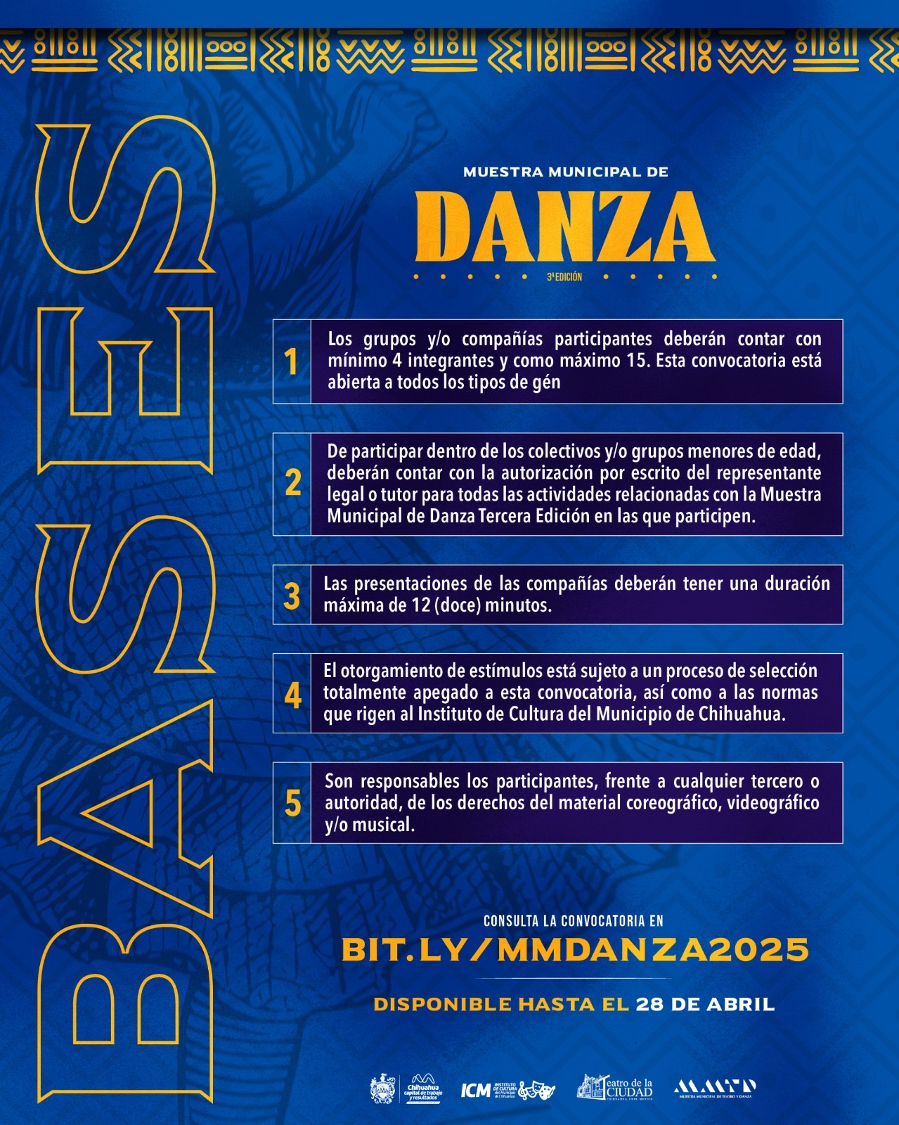 Leer másChihuahua, Chih.- El Instituto de Cultura del Municipio la convocatoria de la Muestra Municipal de Danza que va dirigida a grupos, compañías, colectivos y productores(as) de teatro y danza de Chihuahua Capital. Para los grupos y compañías interesados en presentar su proyecto, municipio da a conocer las bases que deben cumplir para su participación en esta tercera edición: • Número de integrantes: Cada grupo o compañía deberá estar conformado por un mínimo ...