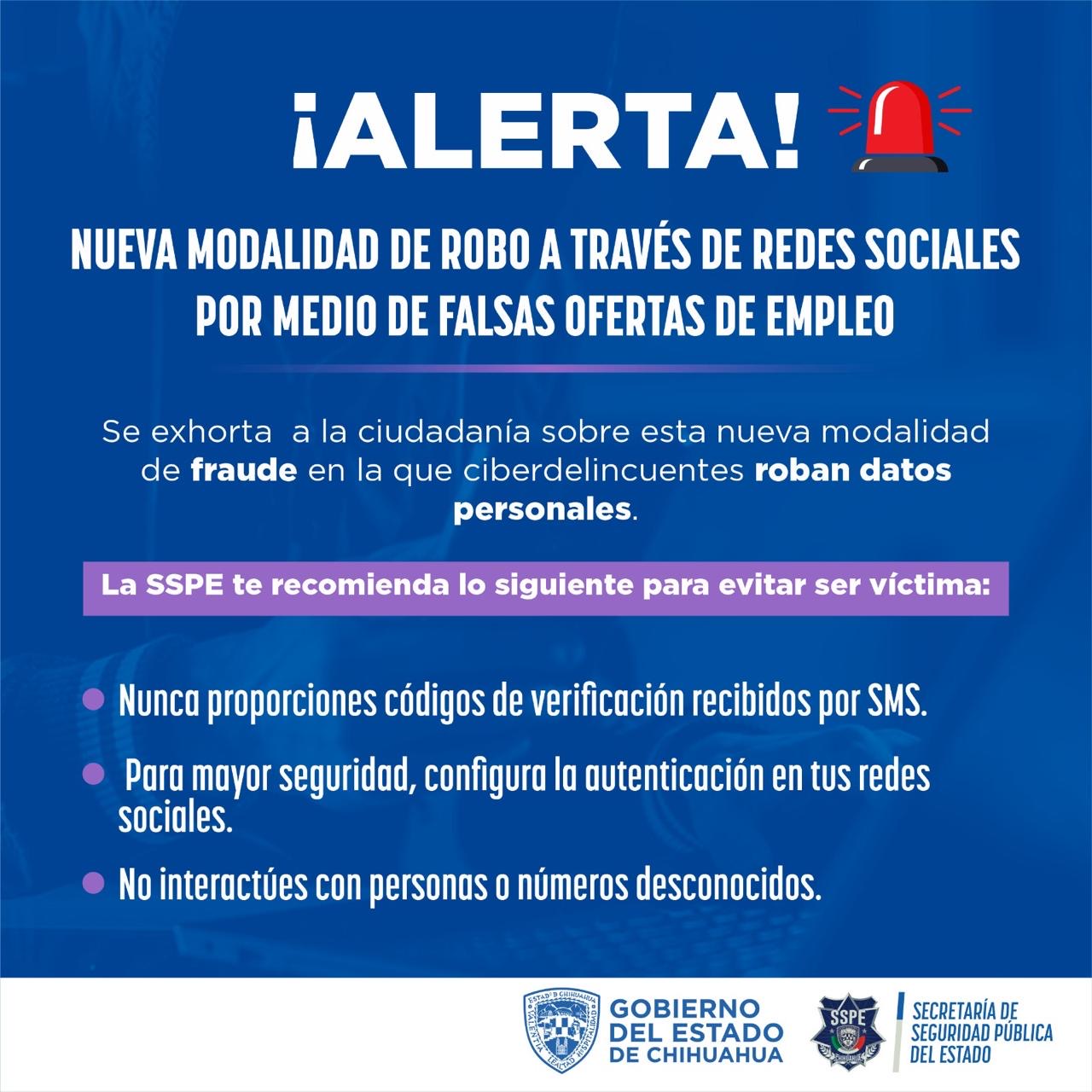 Leer másChihuahua.- La Secretaría de Seguridad Pública del Estado (SSPE), a través de la Unidad de Policía Cibernética, detectó un nuevo modus operandi de los ciberdelincuentes que pretende el robo de cuentas y de datos personales, mediante publicaciones de falsas ofertas de empleo, por lo que se alerta a la ciudadanía sobre esta nueva modalidad de fraude. Esta práctica ha sido detectada a través de reportes ciudadanos y representa un riesgo para ...