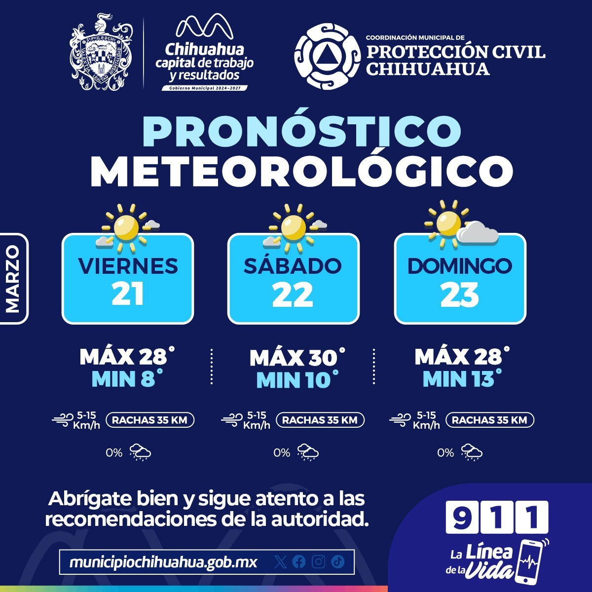 Leer másChihuahua, Chih.- La Coordinación Municipal de Protección Civil, informa que este fin de semana, del 21 al 23 de marzo, se prevén temperaturas máximas de 30°C y mínimas de 8°C. De acuerdo al pronóstico del clima que emite el Servicio Meteorológico Nacional de CONAGUA, este viernes la temperatura máxima alcanzará los 28°C, con una mínima de 8°C y cielo mayormente soleado. Para el día sábado, subirá la temperatura a 30°C, y una ...