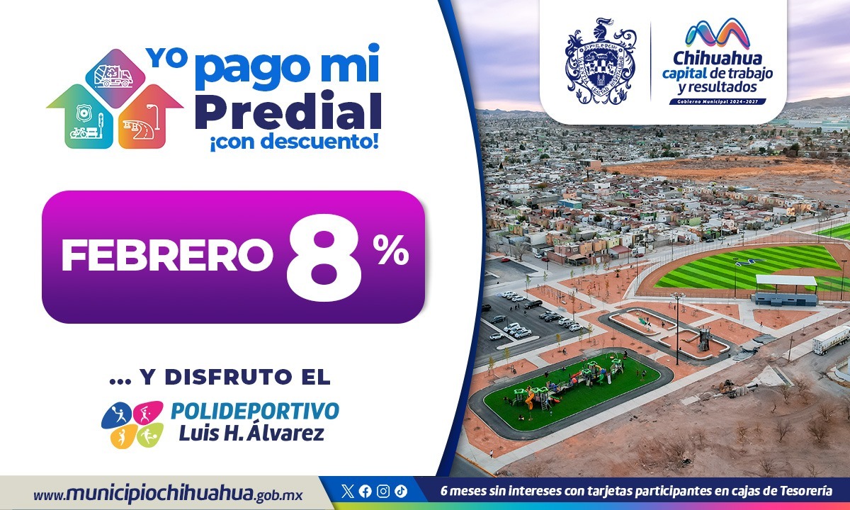 Leer másChihuahua, Chih.- El Gobierno Municipal, a través de Tesorería, invita a aprovechar el descuento del 8 por ciento en el pago del Impuesto Predial que estará vigente todo el mes de febrero, para personas físicas y morales. Por ello, se invita a las y los contribuyentes que aún no hacen el pago a que aprovechen este estímulo, así como recordar que pueden pagar a seis meses sin intereses en cualquiera de ...
