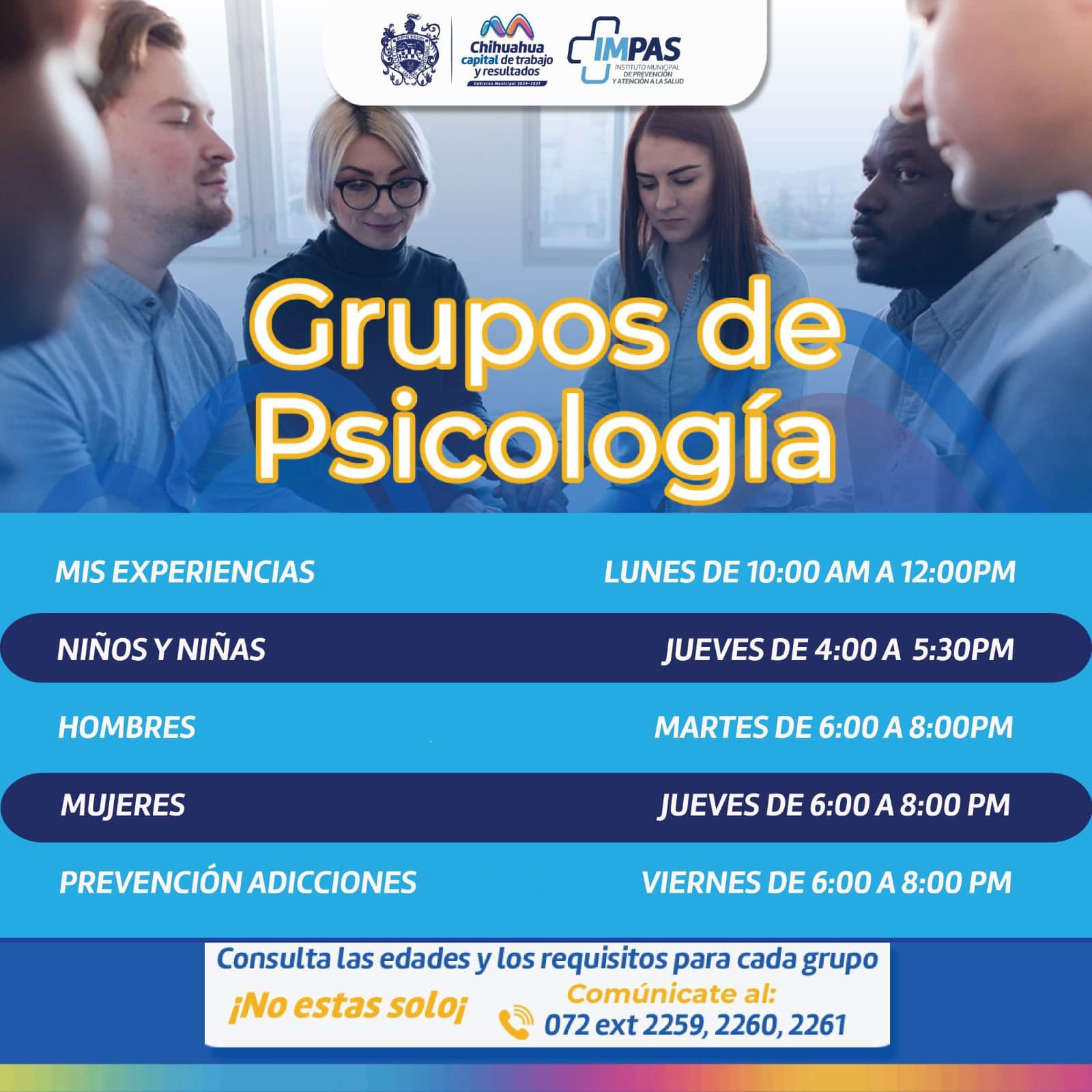 Leer másChihuahua, Chih.- Con el objetivo de fortalecer la salud mental de las y los chihuahuenses, el Gobierno Municipal, a través del Instituto Municipal de Prevención y Atención a la Salud (IMPAS) pone a disposición de la ciudadanía los grupos terapéuticos. Se ofrecen de forma manera presencial en las instalaciones del IMPAS en calle Francisco Xavier Mina número 408, o bien, de forma virtual vía Zoom. Los grupos se reúnen de manera semanal, ...