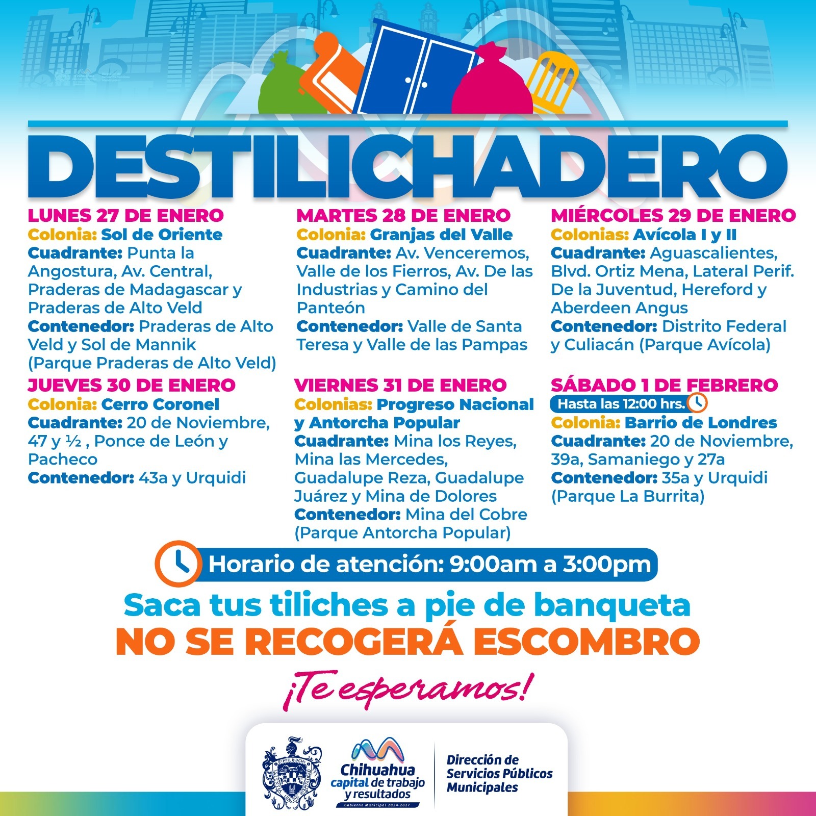 Leer másChihuahua, Chih.- El Destilichadero consiste en retirar basura de grandes dimensiones que el camión recolector no puede trasladar, por lo que se pone a disposición de la población un contenedor en un punto fijo en un horario de 9:00 de la mañana a 3:00 de la tarde de lunes a viernes, mientras que el sábado de 9:00 am a 12:00 del mediodía. Aunado a ello, se realizan recorridos por los cuadrantes ...