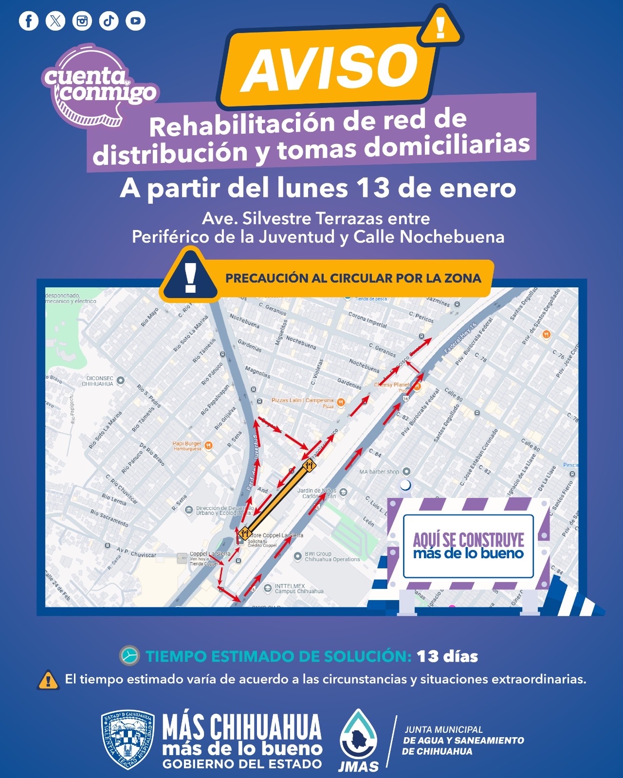 Leer másChihuahua, Chih.- Como parte de las acciones para mejorar la red de agua potable de la ciudad de Chihuahua, la Junta Municipal de Agua y Saneamiento (JMAS) iniciará a partir de este lunes, los trabajos de rehabilitación de la red de distribución y tomas domiciliarias, en avenida Silvestre Terrazas, entre periférico de la Juventud y calle Nochebuena. Es por ello que, a partir de la fecha mencionada y hasta el 26 ...