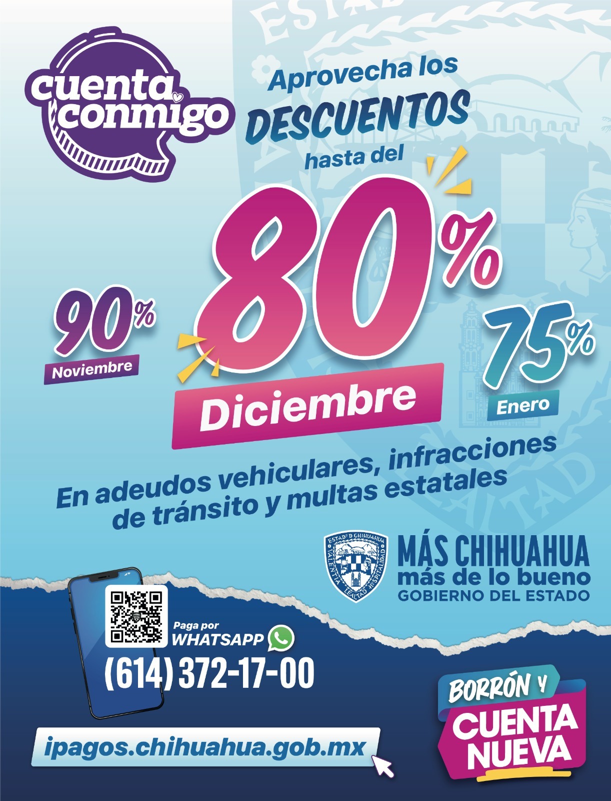 Leer másChihuahua, Chih.- El Gobierno del Estado de Chihuahua invita a las y los contribuyentes a ponerse al corriente con sus adeudos vehiculares y fiscales, a través de los incentivos que continúan vigentes durante el mes de diciembre. Para ello se habilitaron diversas modalidades a través de las cuales la población puede realizar sus pagos para aprovechar así todos los beneficios que el programa Borrón y Cuenta Nueva tiene disponibles. Dentro de los ...