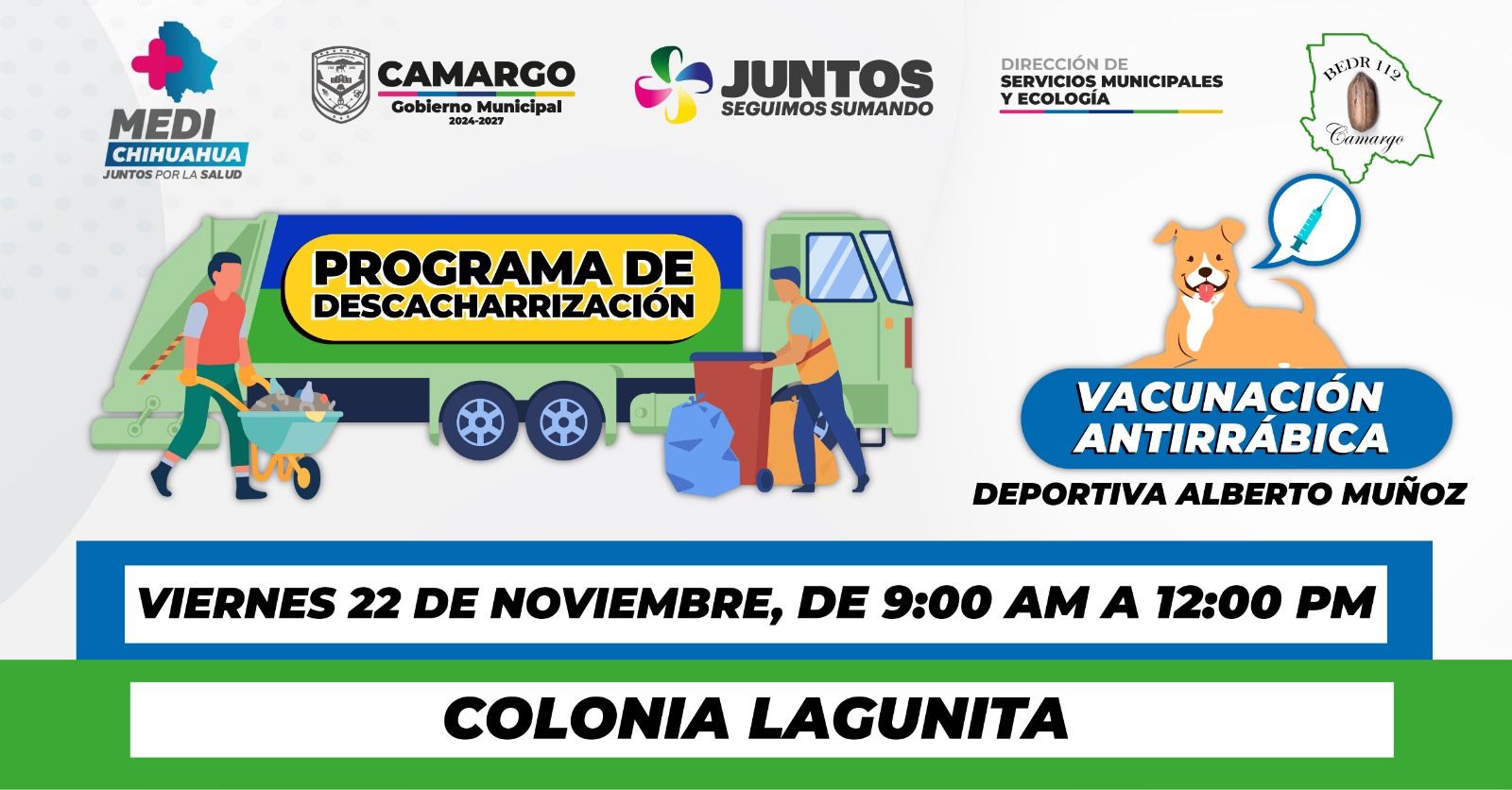 Leer másCamargo, Chih.- El Gobierno Municipal de Camargo invita a las y los vecinos de la colonia Lagunita a unirse a esta jornada, diseñada para fortalecer la salud pública y mejorar el bienestar de las familias y sus mascotas. Estas acciones son fundamentales para prevenir enfermedades y mantener un entorno más limpio y seguro. El presidente municipal, Jorge Aldana, destacó: “Nuestro compromiso es trabajar juntos por un Camargo más saludable y limpio. ...