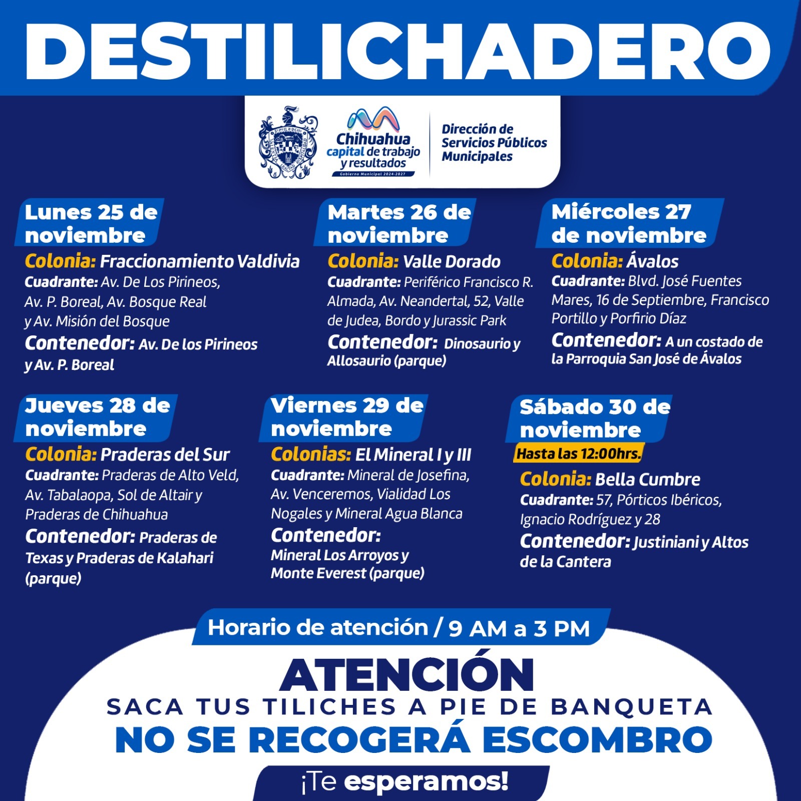 Leer másPara evitar acumulaciones de basura de grandes dimensiones en las viviendas, que podría generar plagas o problemas de salud, el Gobierno Municipal, a través de la Dirección de Servicios Públicos Municipales, informa el calendario del programa Destilichadero, que se realizará del 25 al 30 de noviembre en seis colonias de la Capital. A continuación, se muestra el calendario de colonias que visitará el programa: Lunes 25 de noviembre Colonia: Fraccionamiento Valdivia Cuadrante: Av. De ...