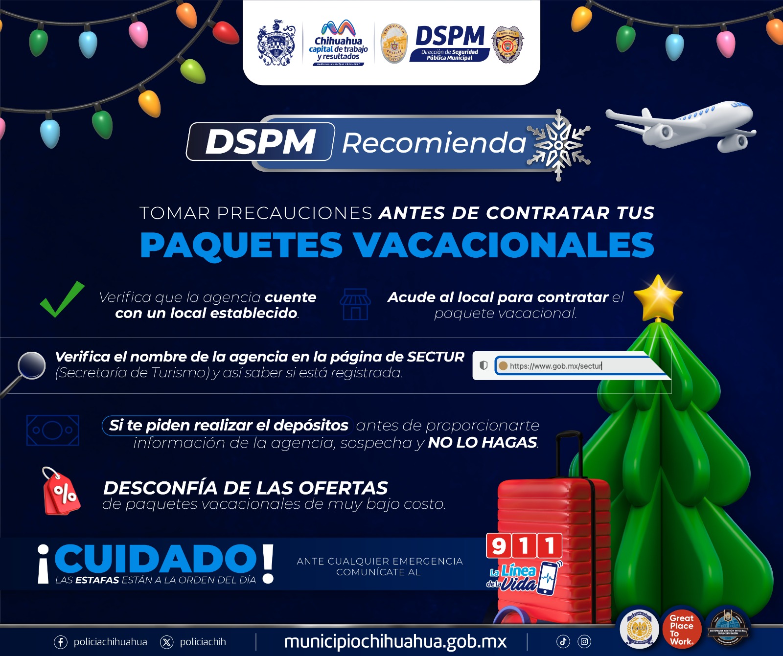 Chihuahua, Chih.- Debido a que cada vez más personas contratan paquetes vacacionales a través de internet, la Dirección de Seguridad Pública Municipal (DSPM) por medio de su Policía Cibernética, pide verificar que se trate de agencias fiables y seguras, a fin de evitar caer en estafas de ciberdelincuentes que buscan hacerse de dinero de manera ilegal. Cuando se aproximan las fechas de vacaciones, se incrementan las transacciones de este tipo en ...