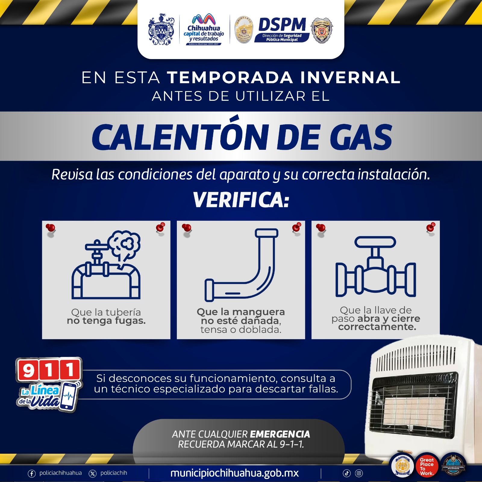 Chihuahua, Chih.- Con el objetivo de prevenir accidentes provocados por la deficiente o incorrecta instalación de líneas de gas en calentones, tanques, estufas u otros aparatos que se utilizan en el hogar o en los negocios, el Heroico Cuerpo de Bomberos pide seguir las siguientes recomendaciones que ayudarán a pasar una temporada invernal sin contratiempos. Sigue estas indicaciones y evita incidentes con las líneas de gas: • Utiliza manguera flexible especial para ...