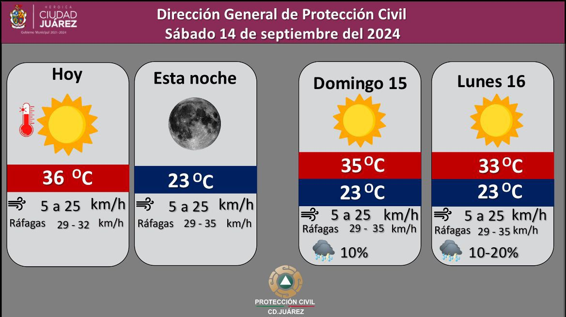 Leer másCiudad Juárez, Chih.- La Dirección de Protección Civil informa que para hoy sábado, se espera un cielo despejado, con temperatura máxima de 36 grados Centígrados y mínima de 23 grados. Se espera que el viento oscile entre los 5 y 25 kilómetros por hora, con posibilidad de ráfagas de viento que alcancen una velocidad de entre 29 y 35 kilómetros y sin posibilidad de lluvias Para mañana domingo, se espera que el ...