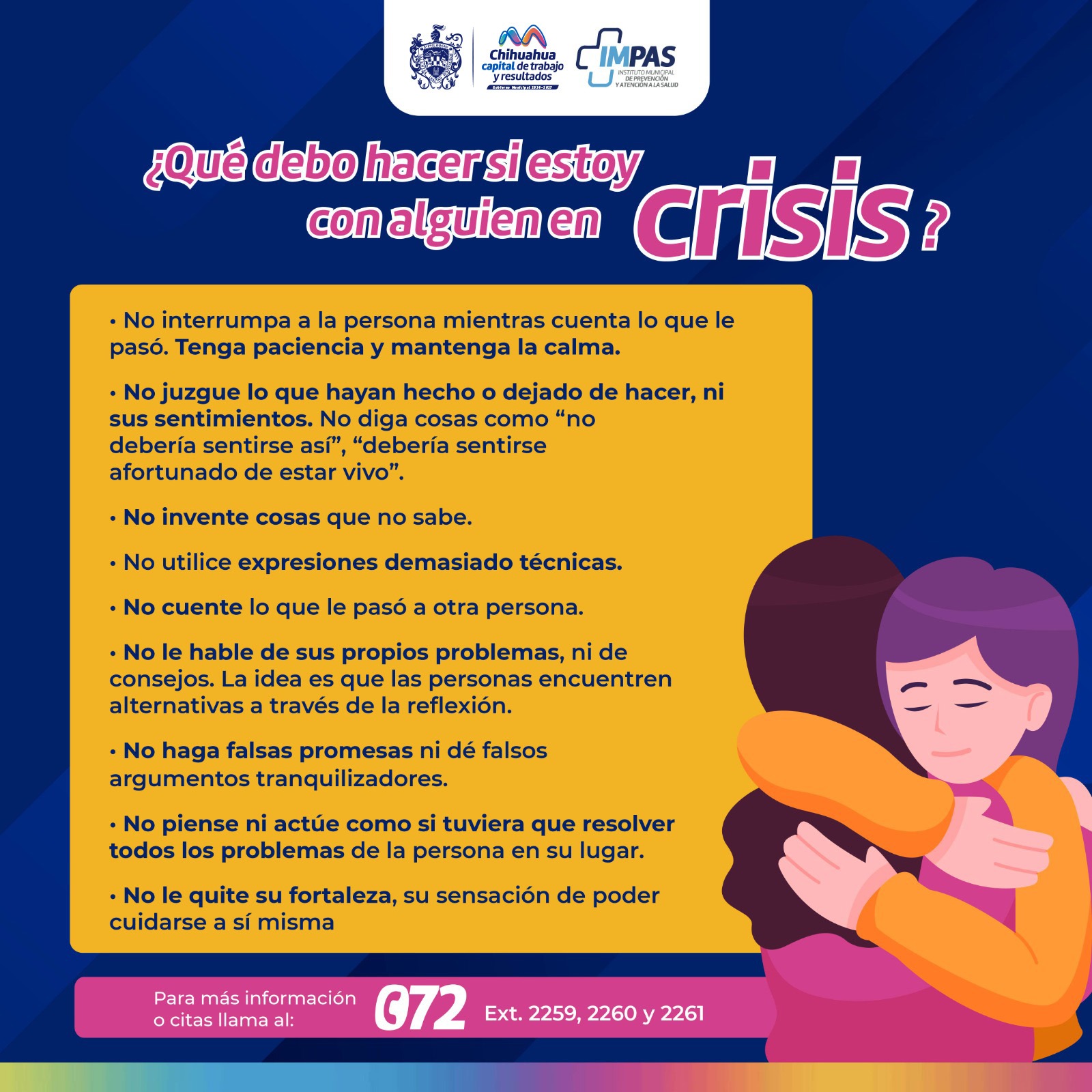Chihuahua, Chih.- El Gobierno Municipal, a través del Instituto Municipal de Prevención y Atención a la Salud (IMPAS), emite recomendaciones para actuar adecuadamente en caso de acompañar a una persona que esté pasando por una crisis emocional. Se recomienda: * Escuchar atentamente a la persona mientras cuenta qué le pasó. Hay que tener paciencia y calma. * No juzgar lo que se haya hecho o dejado de hacer, ni sentimientos. Evitar frases como ...