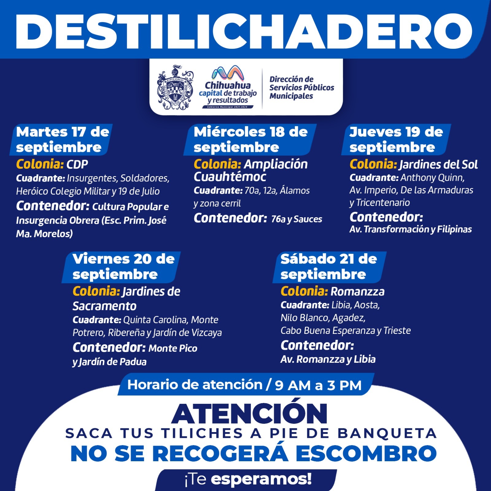 Leer másChihuahua, Chih.- Para evitar acumulaciones de basura de grandes dimensiones en las viviendas, que podría generar plagas o problemas de salud, el Gobierno Municipal, a través de la Dirección de Servicios Públicos Municipales, informa el calendario del programa Destilichadero, que se realizará del 17 al 21 de septiembre en cinco colonias de la Capital. A continuación, se muestra el calendario de colonias que visitará el programa: Martes 17 de Septiembre Colonia: CDP Cuadrante: Insurgentes, ...