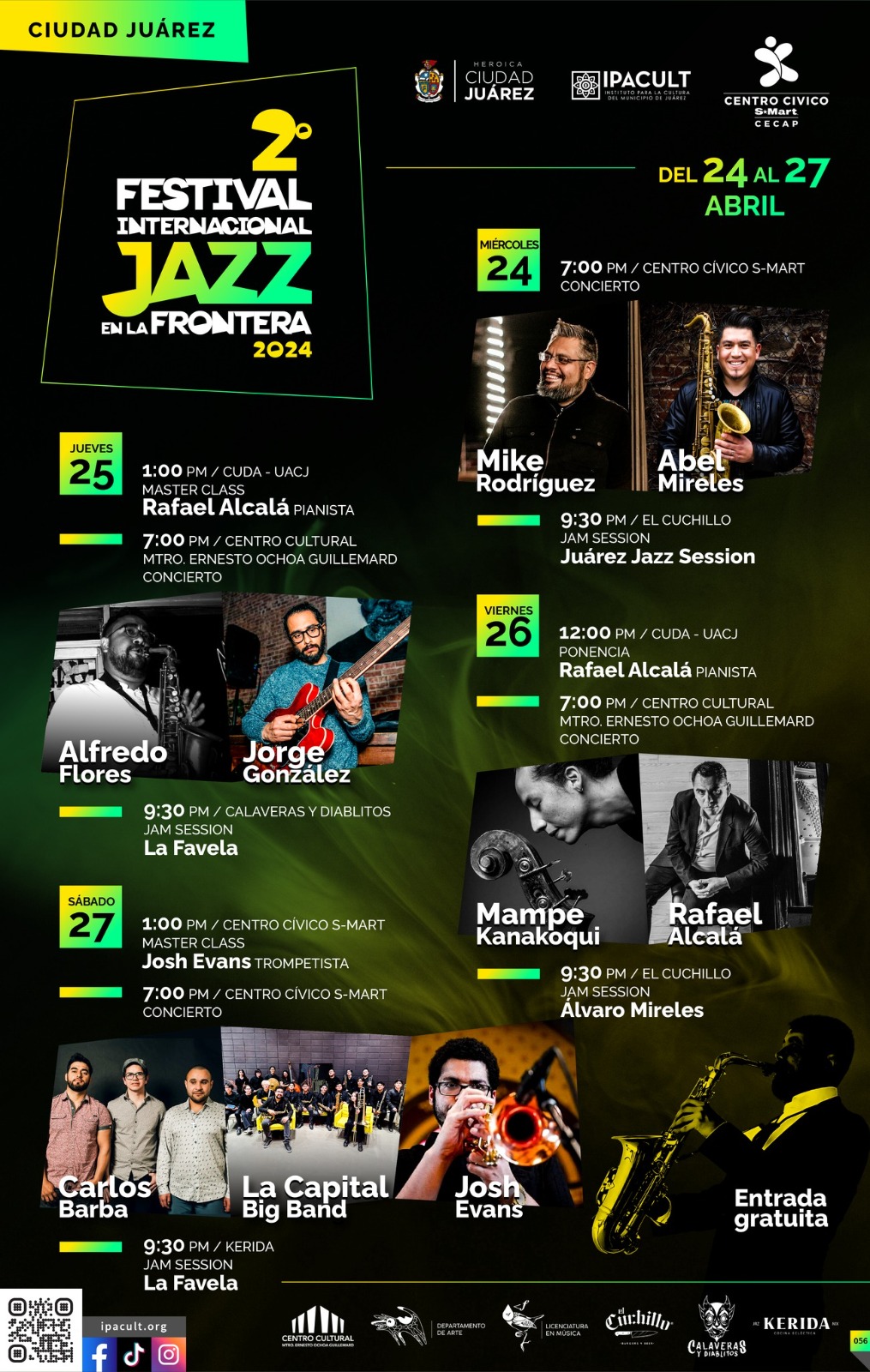 Leer másCiudad Juárez.- Los ciudadanos podrán disfrutar del segundo Festival Internacional Jazz en la Frontera, el cual contará con excelente música a través de conciertos, jam sesión, ponencias y master class, todo de forma gratuita. La titular del Instituto para la Cultura del Municipio de Juárez (IPACULT) dio a conocer las diversas actividades que podrán presenciar los juarenses del 24 al 27 de abril. La cartelera se conforma de la siguiente manera: Miércoles 24 ...
