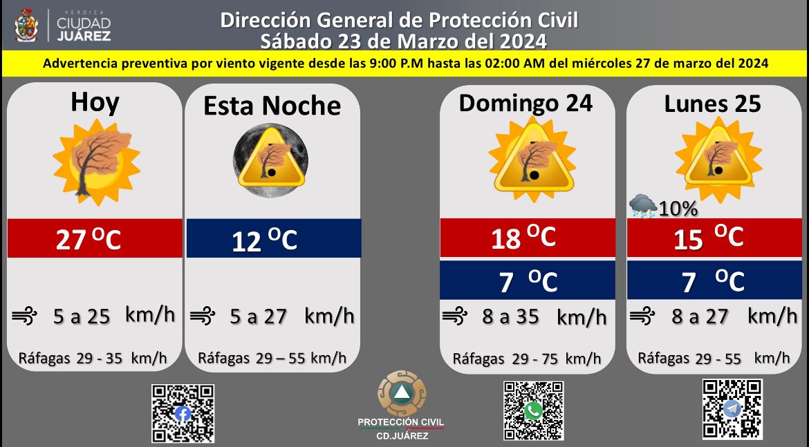 Leer másCiudad Juárez.- La Dirección General de Protección Civil, con base en informes del Servicio Meteorológico Nacional, pronostica un sábado parcialmente nublado con una temperatura máxima de 27 grados Celsius, mientras que la mínima será de 12 °C para esta noche. Se informó que para hoy se esperan fuertes ráfagas de viento que alcanzarán los 55 kilómetros por hora, en tanto que la velocidad del viento durante el día oscilará entre 5 ...