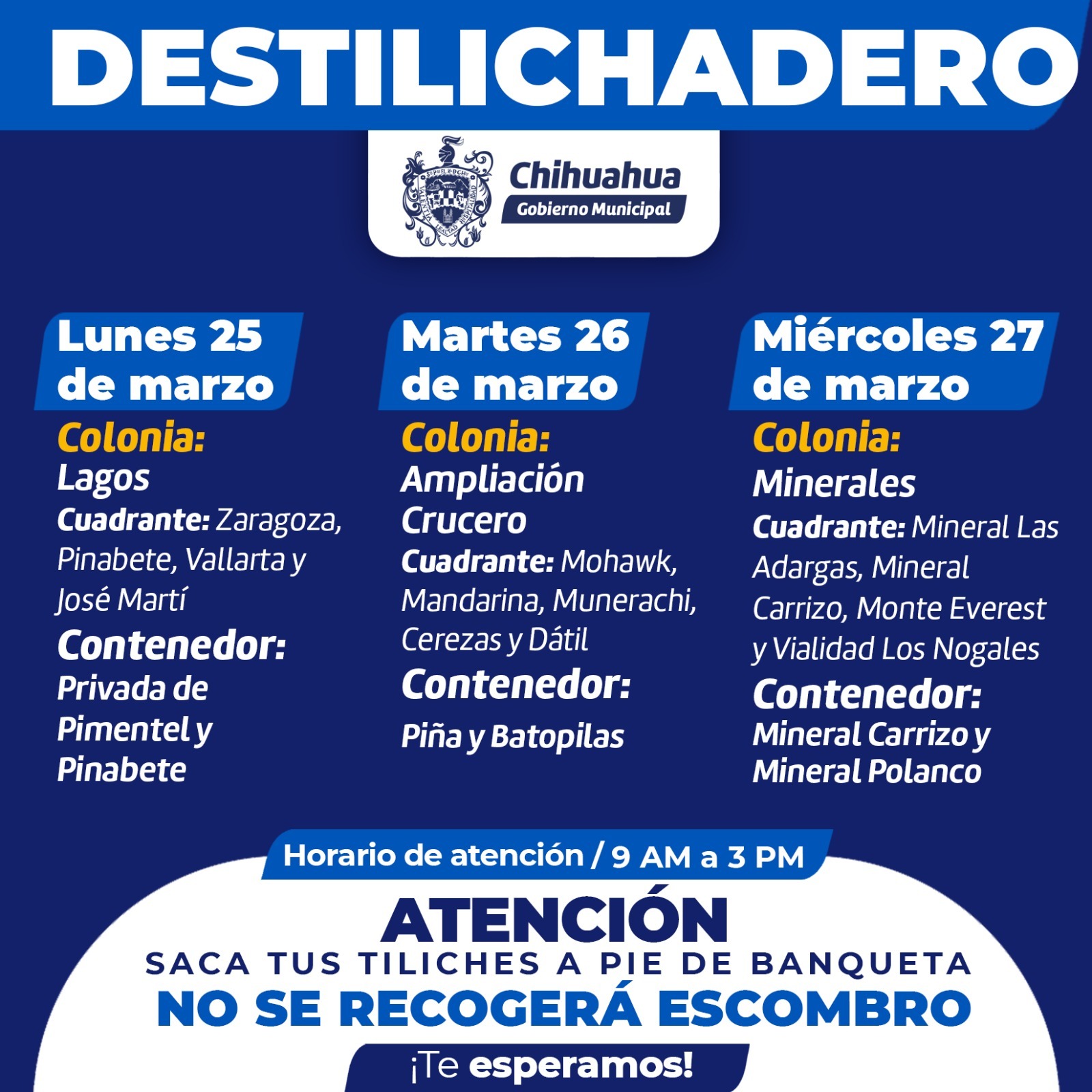 Leer másChihuahua, Chih.- Con el objetivo de evitar acumulaciones de basura de grandes dimensiones en las viviendas lo que podría generar plagas o problematicas en la salud, el Gobierno Municipal, a través de la Dirección de Servicios Públicos Municipales, informa el calendario del programa Destilichadero que se realizará del 25 al 27 de marzo en tres colonias de la Capital. El Destilichadero consiste en retirar basura de grandes dimensiones que el camión ...