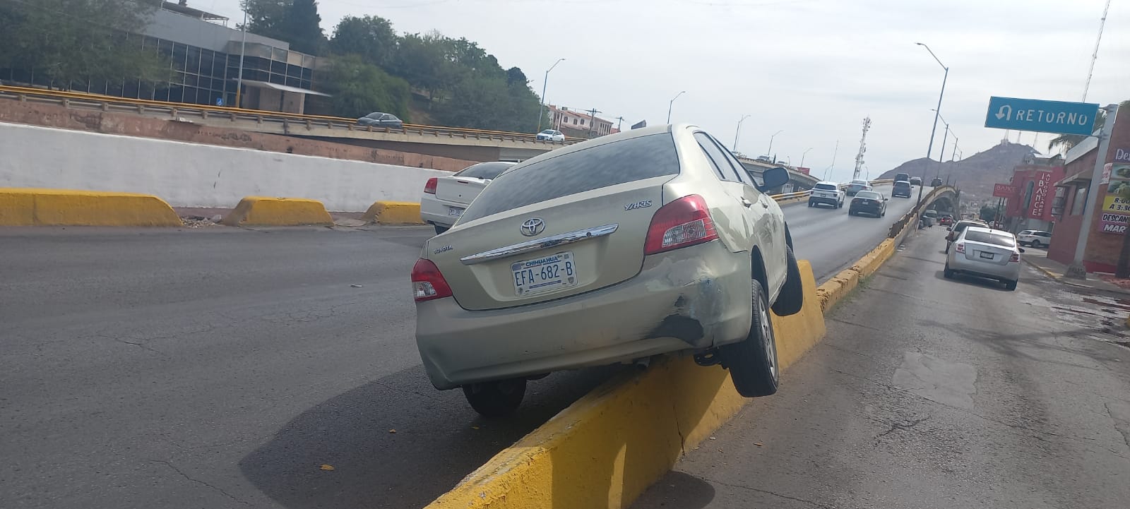 Chihuahua.- La conductora de un vehículo, Toyota, Yaris, perdió el control del volante y se impacto contra el muro y quedó encampanado del puente de la avenida Teófilo Borunda e Independencia, en sentido de poniente a oriente.
