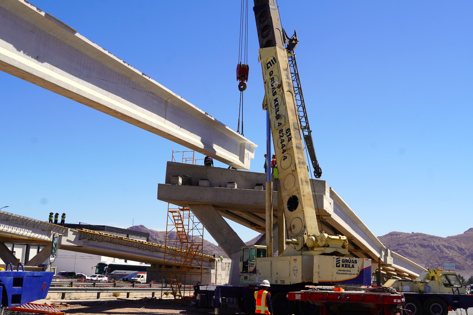 Chihuahua, Chih.- El Gobierno Municipal de Chihuahua, a través de la Dirección de Obras Públicas, continúa con el desarrollo del paso superior en la intersección de Vialidad Los Nogales y avenida De las Industrias, una obra clave para mejorar la movilidad en la zona norte de la capital.