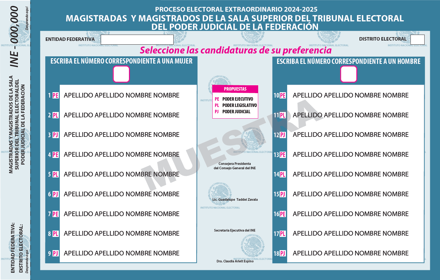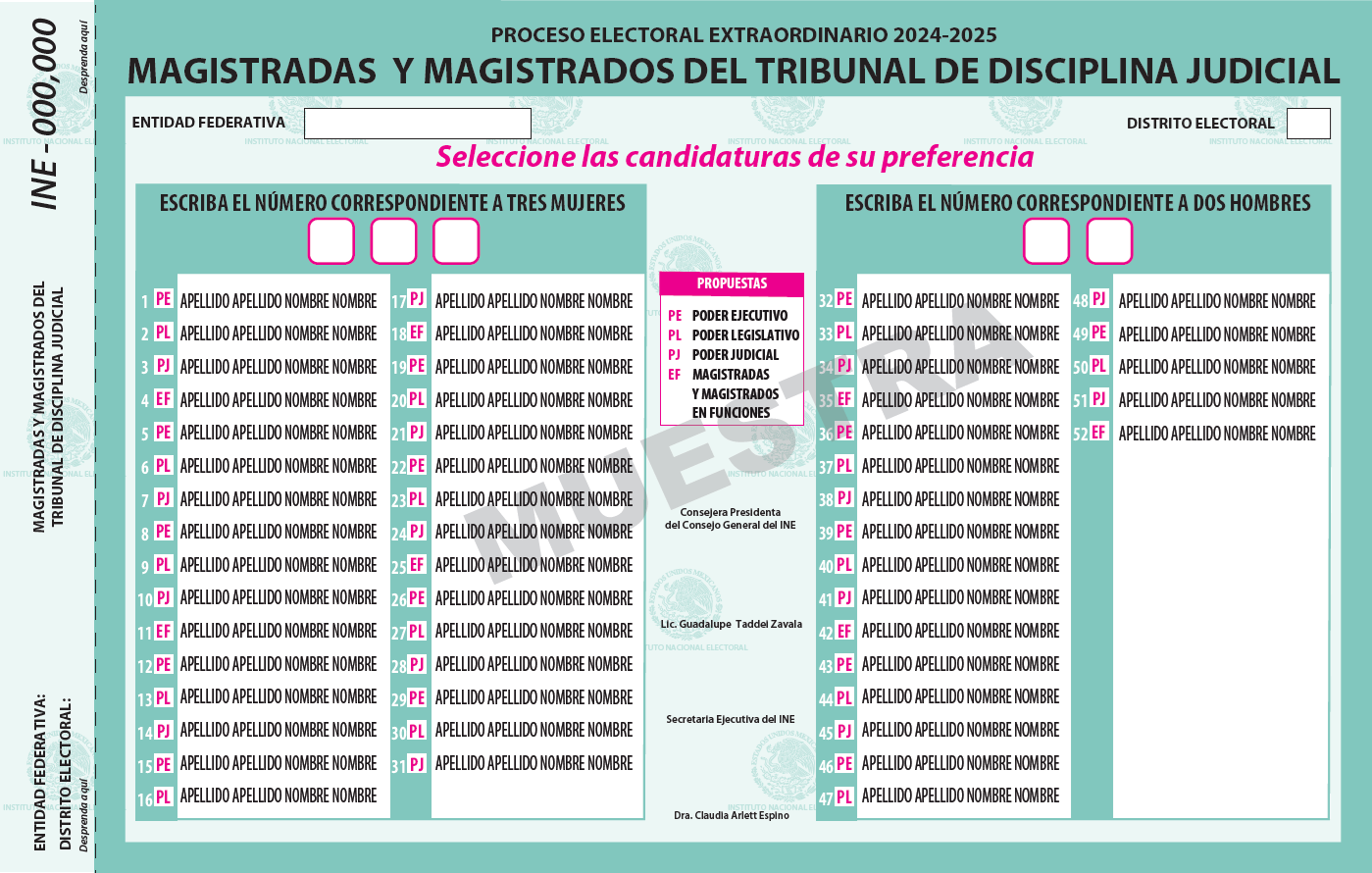 Además, en el caso de las boletas para elegir a magistraturas de Circuito, así como juezas y jueces de Distrito, dichos recuadros se distinguirán por color, de acuerdo con la especialidad de la candidatura por la que se votará.