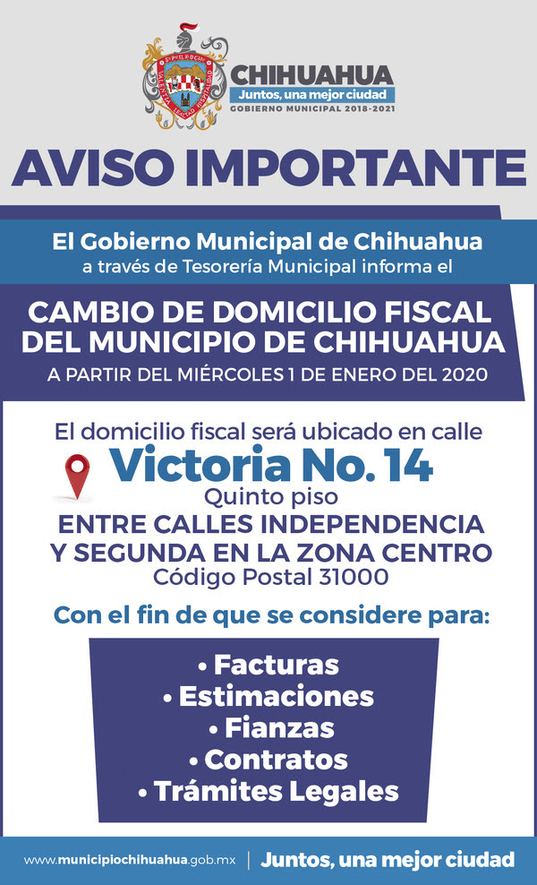 El Gobierno Municipal informa que a partir del 1 de enero 2020 su domicilio fiscal cambiará, ubicándose en calle Victoria número 14 entre calles Independencia y Segunda, zona centro, en el quinto piso.