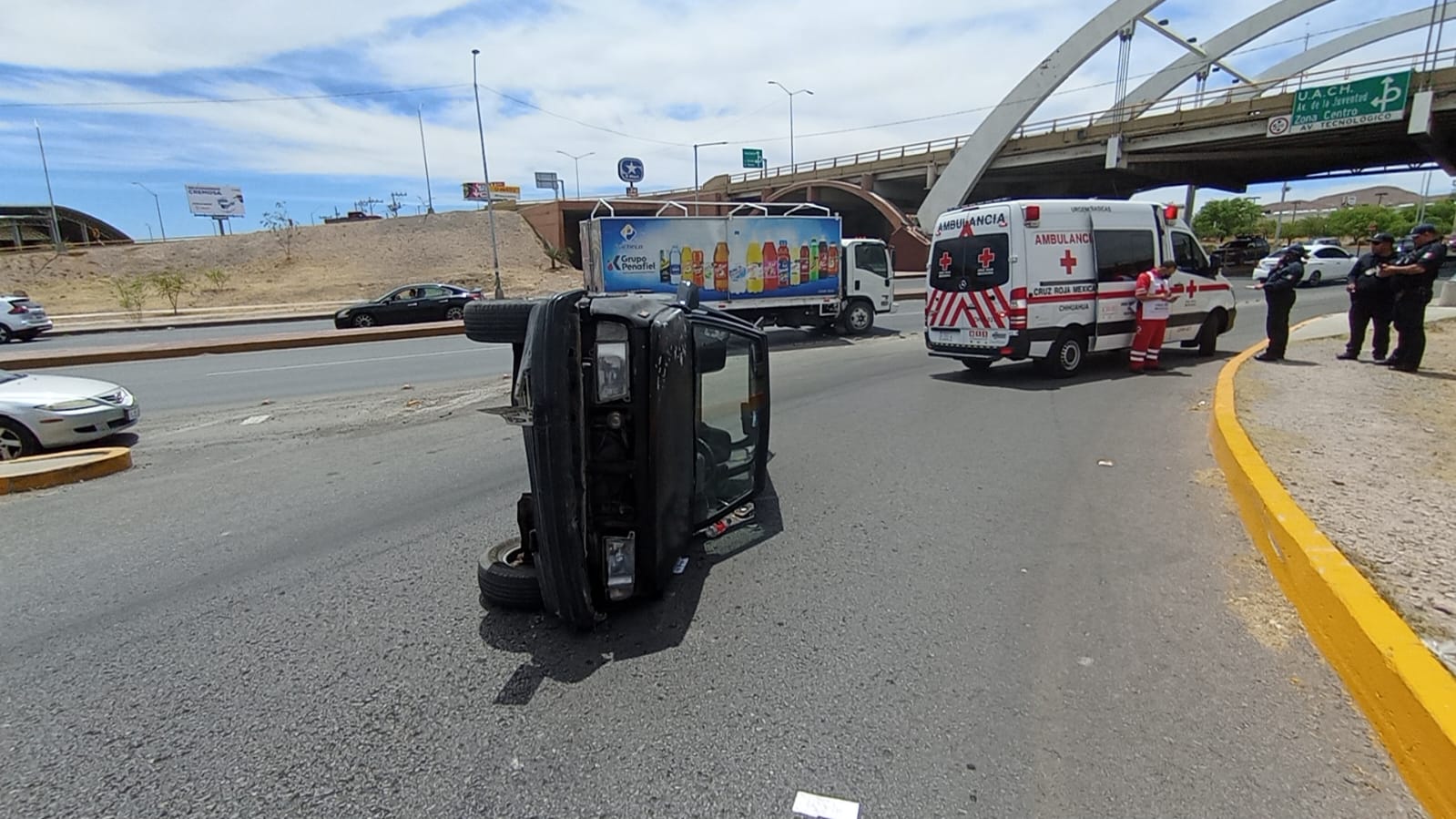 Chihuahua.- Tome sus precauciones ya que en el trébol de acceso que viene de la avenida Tecnológico, en sentido del sur a norte, hacia la avenida Homero, frente a la terminal Norte del Bowi, ocurrió una volcadura de un vehículo Geo Tracker, lo que ocasionó caos vehicular tanto en el trébol como en la avenida Homero.