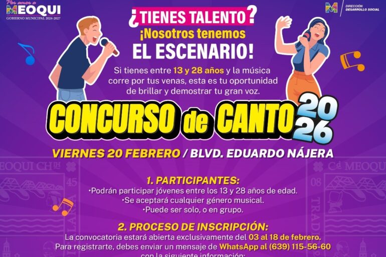 Leer másMeoqui.- El Gobierno Municipal, en coordinación con la Dirección de Desarrollo Social, Juventino de la Cruz Roja y el Instituto Municipal del Deporte y la Juventud, invita a jóvenes de 13 a 28 años de edad apasionados por el canto a registrarse en el Concurso de Canto del evento “Juventud en Acción 2026”, donde se premiará al primer lugar con mil pesos y al segundo lugar con 500 pesos. La ...