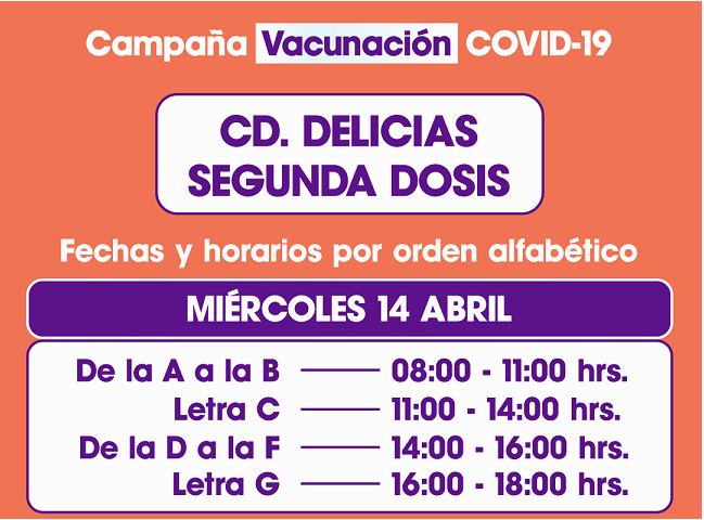 Leer másDelicias.- La subdirectora de Medicina Preventiva y Promoción de la Salud de la Secretaría de Salud, Wendy Ávila Coronado, informó que mañana miércoles 14 de abril inicia la aplicación de la segunda dosis de la vacuna anti-COVID para adultos mayores en la ciudad de Delicias. La doctora Ávila especificó que los puntos de vacunación serán Estadio de Beisbol, Escuela Primaria Melchor Ocampo, Gimnasio Leyes de Reforma, Clínica 11 del IMSS y ...