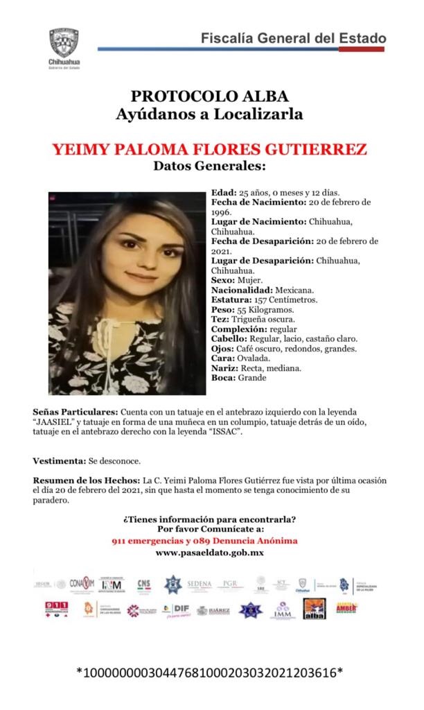 Leer másDelicias.- Familiares y amigos extendieron el llamado a la comunidad para difundir la activación de la segunda fase del Protocolo Alba para localizar a la C. Yeimy Paola Flores Gutiérrez, vista por última ocasión el 20 de febrero de 2021. De acuerdo con la Fiscalía General del Estado, la joven se encontraba en la Ciudad de Delicias, Chihuahua, cuando su familia tuvo contacto con ella vía telefónica por última ocasión y ...