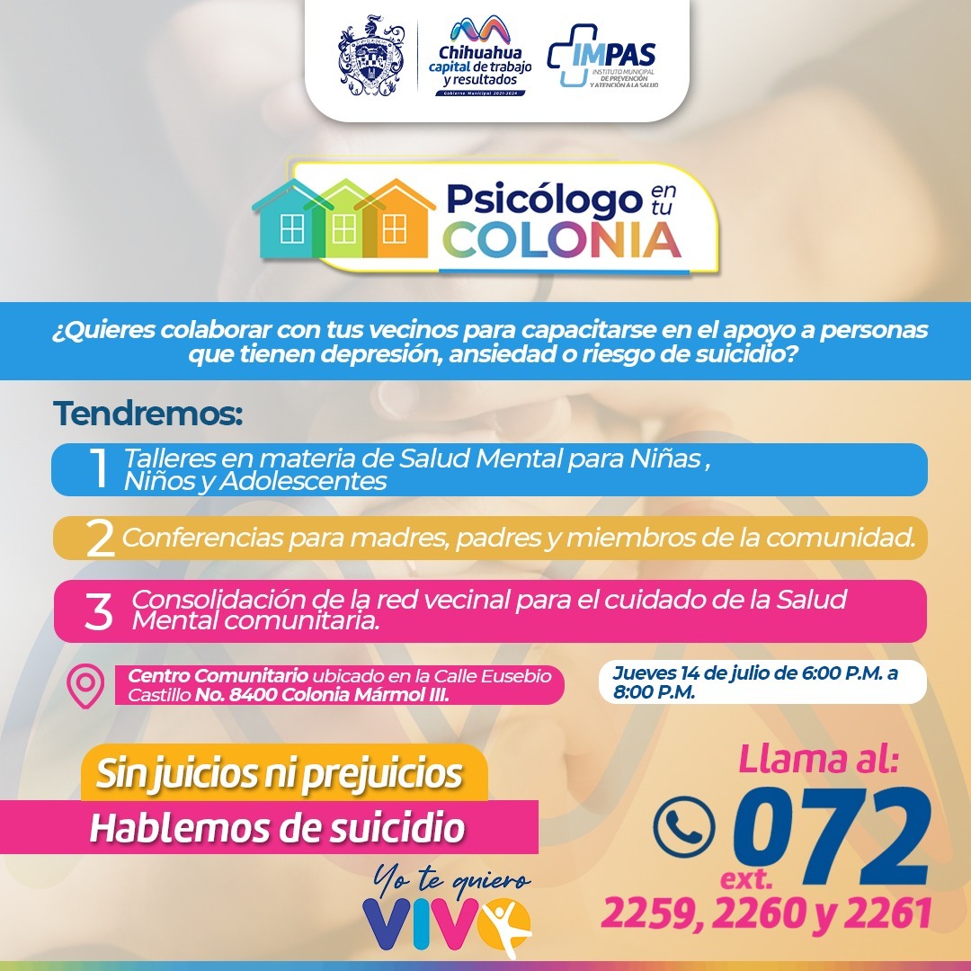 Leer másChihuahua.- El Gobierno Municipal de Chihuahua, a través del Instituto Municipal de Prevención y Atención a la Salud (IMPAS), llevará a cabo el programa “Psicólogo en tu Colonia” como parte de la campaña “Yo te Quiero Vivo”, este jueves 14 de julio en un horario 18:00 a 20:00 horas, en las instalaciones del centro comunitario Mármol III. Las actividades realizadas dentro de este programa, están dirigidas a promover aspectos de prevención ...