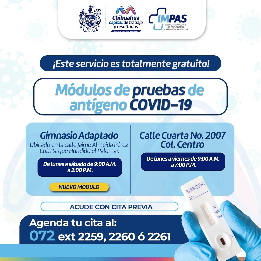 Leer másChihuahua.- El Gobierno Municipal de Chihuahua, a través del Instituto Municipal de Prevención y Atención a la Salud (IMPAS), continúa brindando el servicio de toma de muestras de antígeno para detección de COVID19 de manera gratuita. Para acceder a este servicio las y los chihuahuenses podrán comunicarse al número telefónico 614-200-4800 o al 072 en las extensiones 2259, 2260 y 2261, para agendar una cita para la toma de muestra de ...
