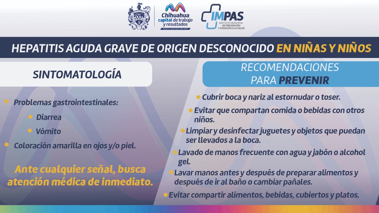 Chihuahua.- El Gobierno Municipal de Chihuahua, a través del Instituto Municipal de Prevención y Atención a la Salud (IMPAS) dio a conocer a la ciudadanía las recomendaciones para prevenir el contagio de Hepatitis aguda grave de origen desconocido en niñas y niños. Tras los recientes registros de contagios de Hepatitis aguda grave de origen desconocido en niñas y niños a nivel mundial, se exhorta a la ciudadanía a permanecer atenta de ...