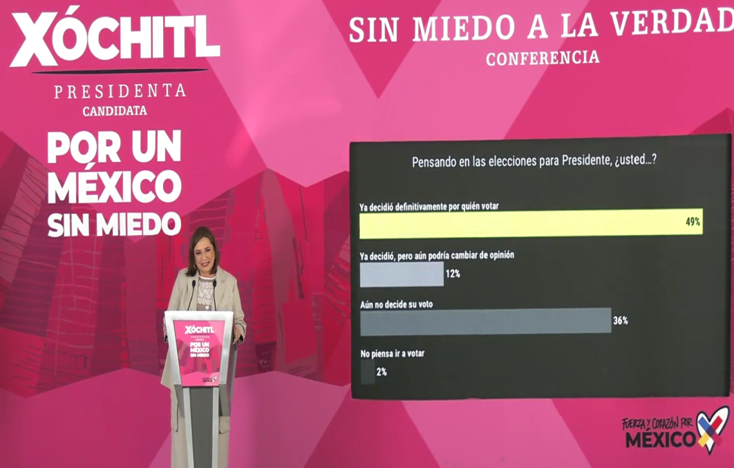 Leer másMéxico.- La candidata de la coalición Fuerza y Corazón por México, Xóchitl Gálvez Ruíz, dijo tener la certeza de que ella ganará la elección presidencial el 2 de junio del 2024. “Tengo la certeza que voy a ganar esta elección, tengo la certeza que los mexicanos están tomando una decisión”, declaró en su Conferencia de la Verdad de este martes 19 de marzo. Para ello, compartió una encuesta en la que se ...